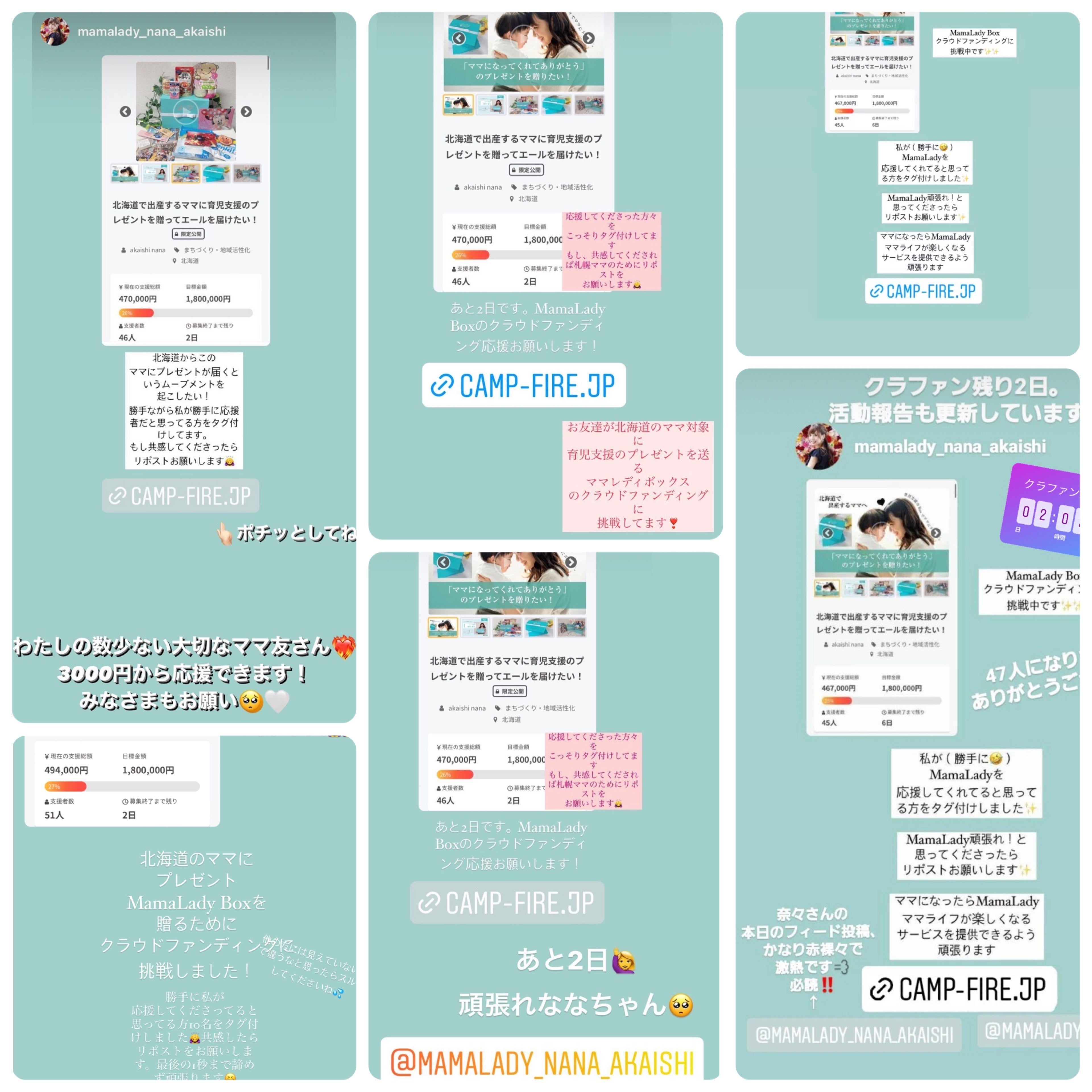 MamaLady Boxのクラウドファンディングにご支援いただいた皆様、このプロジェクトをご覧になってくださった皆様、改めて本当にありがとうございました。株式会社MamaLadyの明石奈々です。MamaLady Boxのクラウドファンディングは最終的に112名もの皆様のご支援、応援をしていただき、無事に目標を達成することができました!クラウドファンディング終了までの数時間の皆様からのご支援には心から感謝をするとともに、この「ママへの」プレゼントがこの社会には必要であるという自信を深めることができました。「頑張ってください」のメッセージにとても感動し、これからこのプロジェクトをすすめていくことへのパワーをたくさんいただきました。本当にありがとうございました。Instagramでは、50件以上のシェアをいただき、私たちと同じ熱量でMamaLady Boxへの応援の呼びかけをしてくださる皆様を見て本当に胸が熱くなりました。MamaLady Boxは4月の発送で第1期の発送が終わり、第2期の発送開始に向けてリニューアル準備を進めています。私は皆様の応援のひとつひとつを思い出すたびに、MamaLady Boxの未来をまっすぐに見ることができます。私は、このクラウドファンディングが達成した瞬間の皆様からの「おめでとう」の言葉を忘れません。皆様の応援が、この日本に、ママへのプレゼントを贈る、そしてそこからママライフを楽しむママレディ女性を増やす文化を創る一歩を踏み出させてくれました。このクラウドファンディングの達成は、MamaLady Boxの始まりです。皆様の応援の上でこうして成り立っていることを心から感謝しています。そして、私は応援してもらったという責任を胸に、必ずこの事業を成し遂げます。支援をしてくださった皆様、1人1人にお礼をいいたいところですが、なかなかかなわないので、まずはメールにて感謝を伝えさせてください。そして、もしもお会いできたときには心からの感謝を伝えさせてください。ご支援いただいた、あなた、のおかげでMamaLady Boxはまた2022年4月に北海道在住のママたちに笑顔をうむことができます。誰かの幸せを願える、ママのことを労い、想う人が112人もいること。私はとても誇りに思います。皆さま、本当にありがとうございました。これからもMamaLady Boxをどうぞよろしくお願いいたします。株式会社MamaLady代表取締役明石奈々
