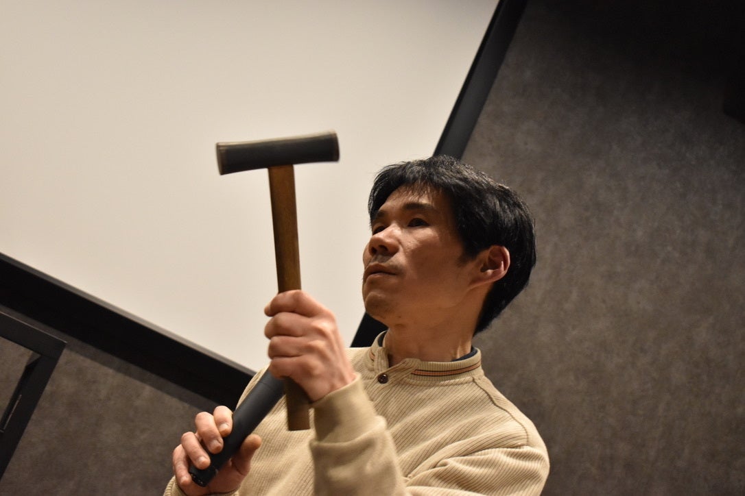 殴ろうとしているわけではありません(笑)。玄能の使い方の説明をしています。