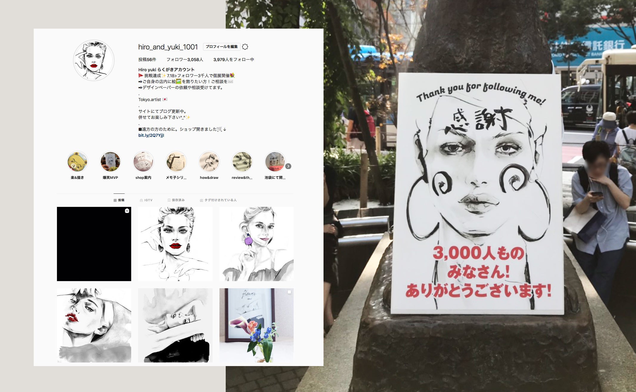 Instagramでイラストを投稿しつつ、自身のオンラインストアにて作品販売やイラストオーダーや人気の美人画、似顔絵オーダー受付けています。