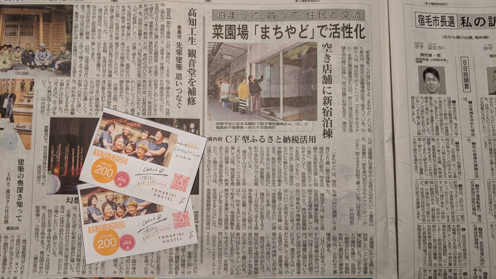 今朝12月4日(水)の高知新聞の地域欄にて、TOMARIGI HOSTELの今回の挑戦について掲載されています!