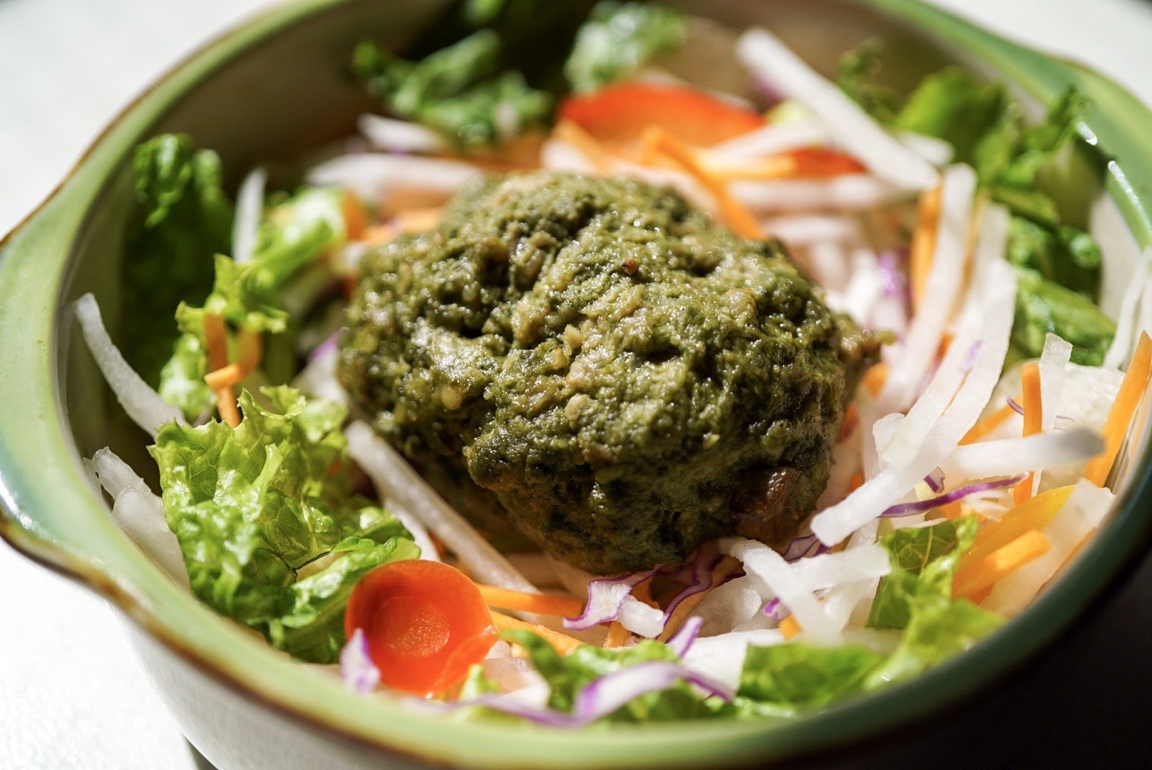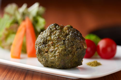 エナジーバーグの外観はグリーンです。これは玉露を混ぜ込んだことによるものですが、初めて見るとびっくりするかもしれません。しかし、実際に食べてみると多少玉露の風味は残るものの、ハンバーグそのものの美味しさの邪魔をすることもなく、上手くマッチしていることに気がつくと思います。さらに他の食材とマッチさせることで、適度な苦味が中和されより深い味わいを楽しめます。