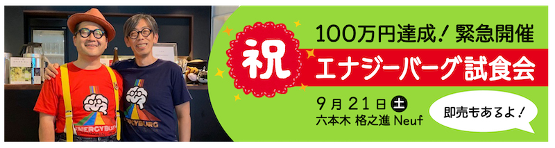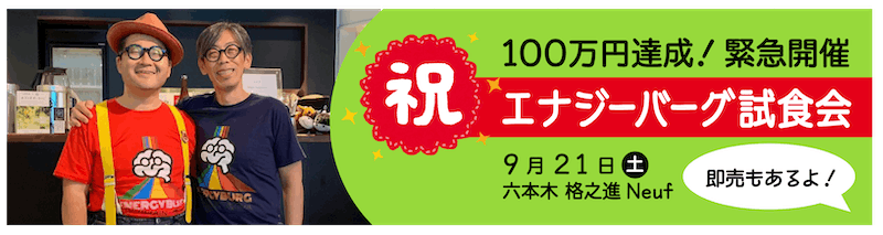 2019/12/12 18:44エナジーバーグ パトロンのみなさま今年も早いものであと2週間。師走で大忙しの毎日かと思いますが、エナジーバーグで元気に乗り越えて頂ければと思います。本日は2点ほど、みなさまにご案内です。エナジーバーグランチ提供開始エナジーバーグはみなさまのご支援により無事商品化を果たし、格之進オンラインストアでも好評販売中ですが、この度、六本木の格之進 Neufにてランチ提供を開始しました!(今までランチはやってなかったのですが、エナジーバーグに加え、おいしいお肉とハンバーグのメニューをご用意してのランチ提供開始です。)パトロンのみなさまには、エナジーバーグのご支援分を還元できるよう、優待価格にてご提供させていただきます。六本木界隈でランチの機会がありましたら、ぜひご利用ください。エナジーバーグ パトロン様限定価格!チョップドサラダ+エナジーバーグ:1600円 --> 1000円(期間:2020/3/31まで)提供店舗:格之進 Neuf (格之進の他店では現在取り扱いがありません)東京都港区六本木7丁目17−19 Second 2F FLEG 六本木03-6459-2235月〜金 11:30~14:00 (L.O.13:30)GoodBrain 公開実験イベント無料ご招待GoodBrainの五感で脳に働きかけるプロジェクト、味覚のエナジーバーグに続き、今度は「音で脳に働きかけるBrain Music」という実験プロジェクトをSpotify・JINSといっしょに進めております。こちらの脳活動計測を含む公開実験イベントを、以下のとおり開催いたします。ご興味のある方がいらしゃいましたら、ぜひご参加ください。(無料ご招待)日時:2019年12月19日 (木) 19:00 - 21:15(受付開始:18:40)会場:デジタルハリウッド大学 駿河台キャンパス 駿河台ホールお申込:https://brainmusic.peatix.com/招待コード:goodbrain(一般:1000円 --> 無料ご招待)一般の実験参加ありなしを選び、クーポンコード入力欄に上記招待コードを入力ください。ランチおよびイベント参加に関し、ご不明な点などありましたら、事務局までご連絡ください。エナジーバーグ事務局 もっと見る