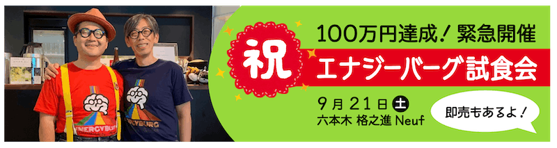 おかげさまで、100万円を超えるご支援を頂き、この度、エナジーバーグの商品化を決定しました。商品化決定にあわせ、みなさまから「早く試食したい」とのお声が多く寄せられたことを受け、この度、下記のとおり、試食会イベントを開催することにしました。
