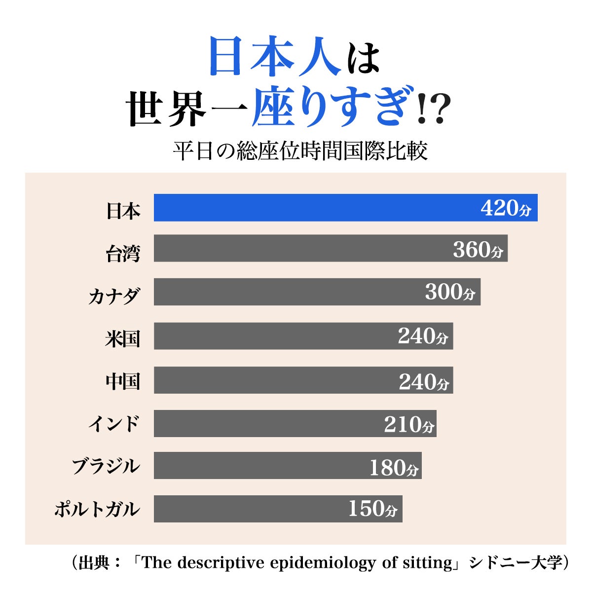 シドニー大学の調査によると、日本人は世界の主要国(調査対象20か国)の中で最も座っている時間が長いそうです。