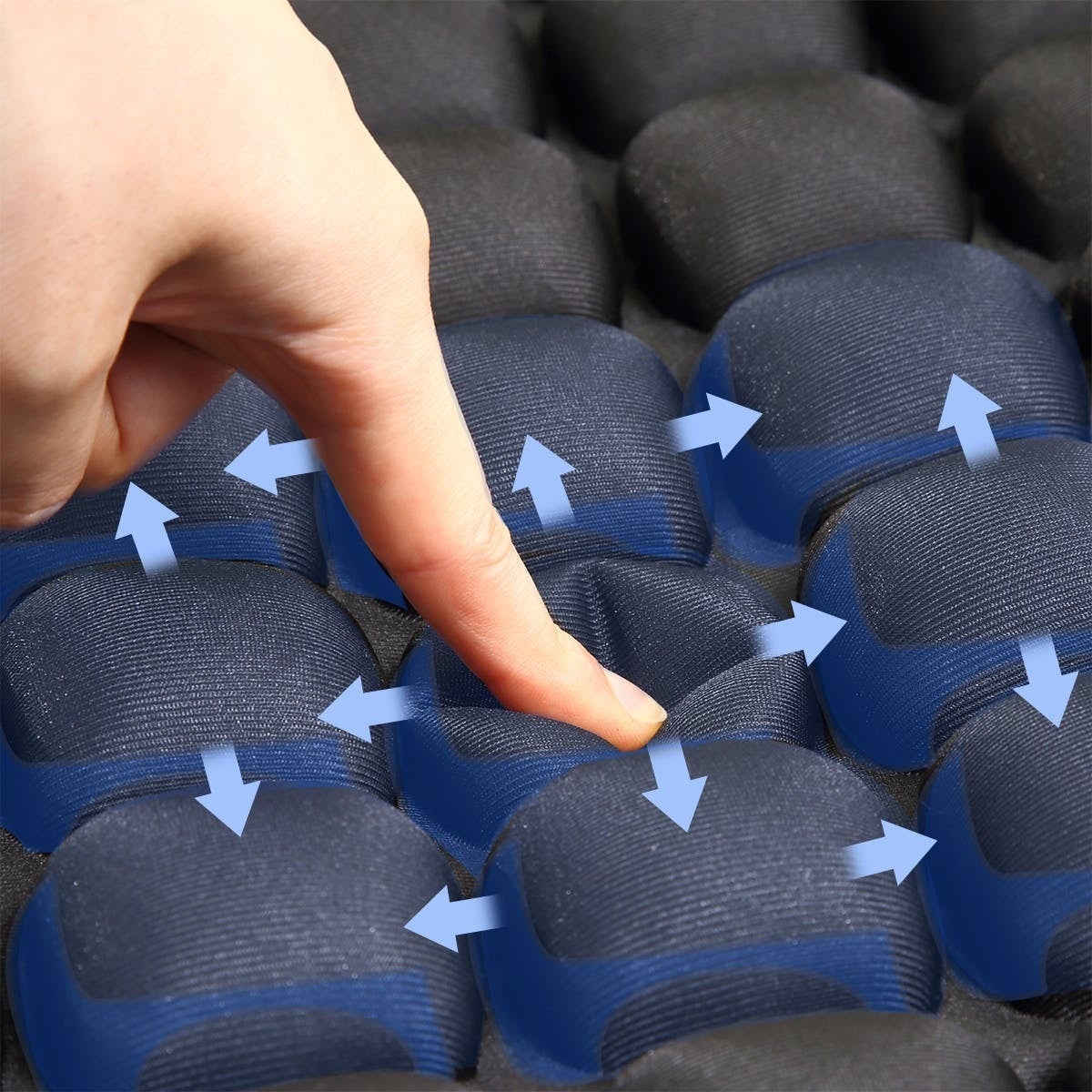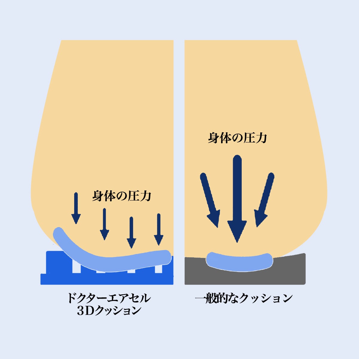 緩衝対流エアセルは、圧力がかかるとセル内の空気が均等に循環することで圧力を分散する機能を発揮します。