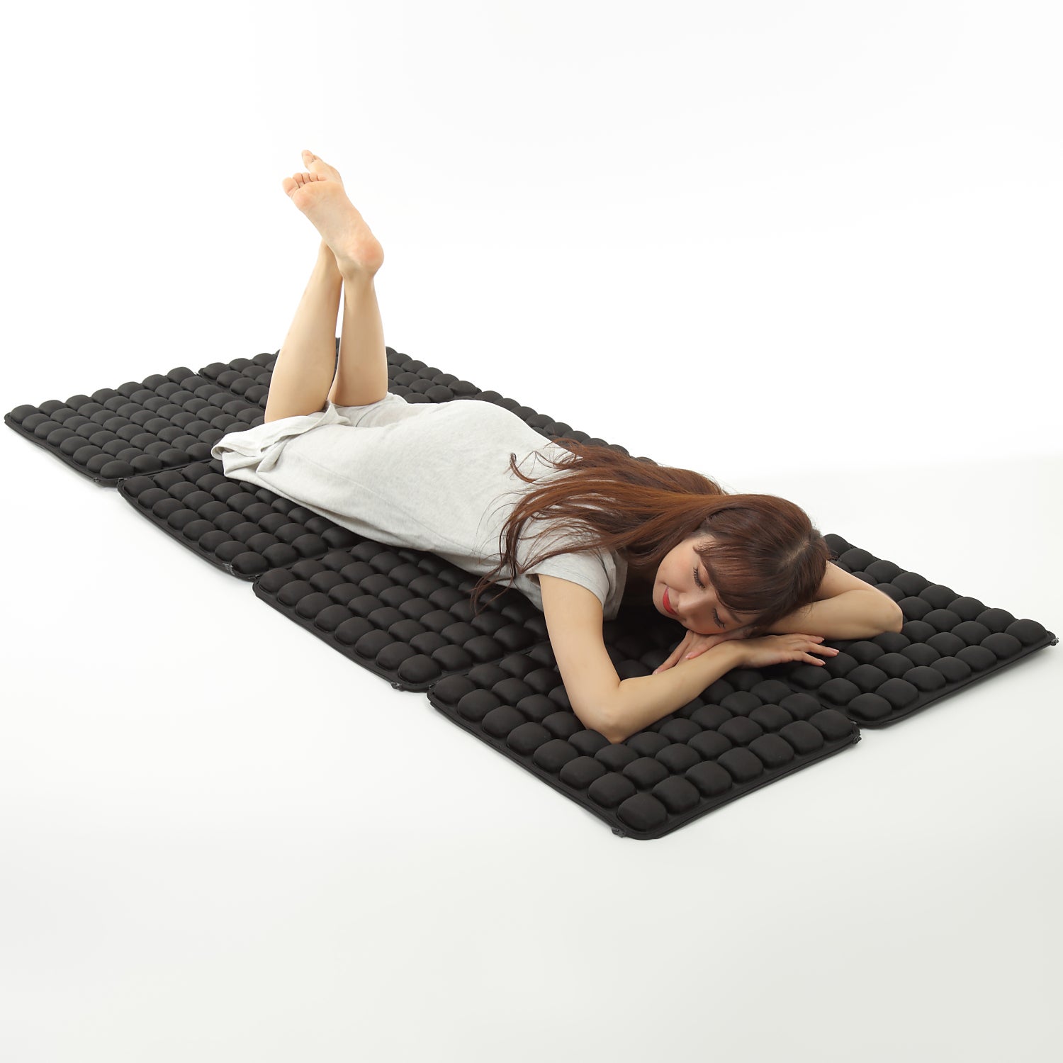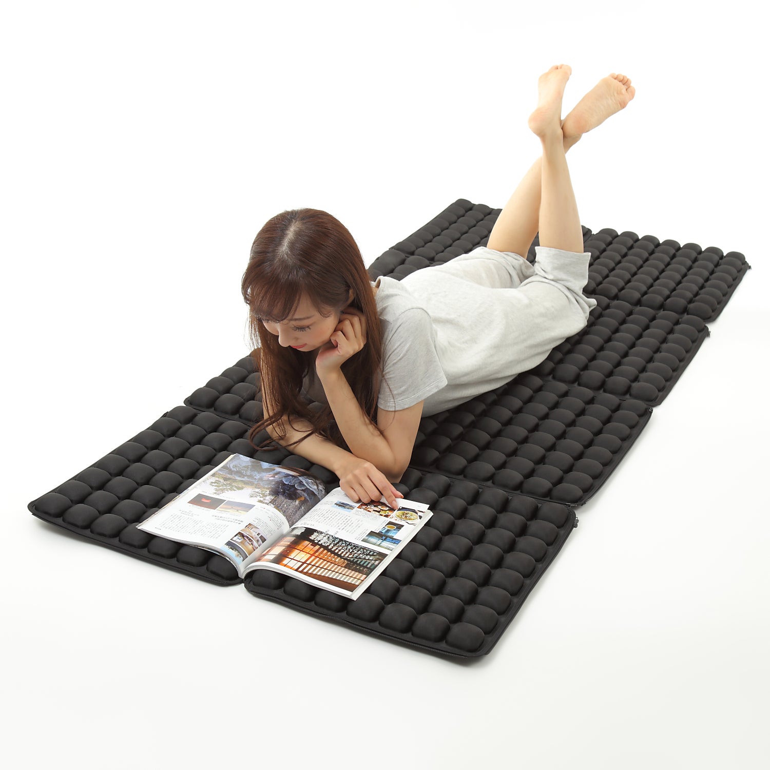 2つ繋ぎ合わせれば背もたれ付きクッションに、8枚つなぎ合わせればゴロ寝用マットとして使用できます。