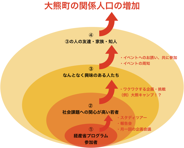 ③の方達の周りの人々で、社会課題などへの興味関心が薄い人々(④)にも、「そういう面白いイベントをやってる大熊町という場所があるのか!」と、町の存在を知っていただきます!