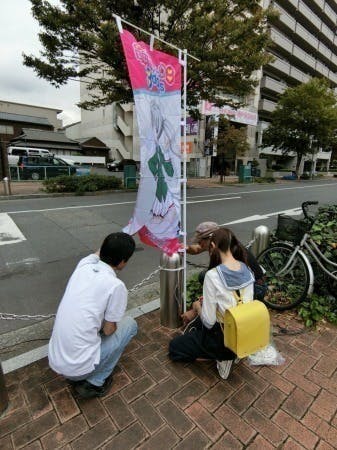 スタッフの手でいっぽんいっぽん丁寧に立てられる萌えサミのぼり。