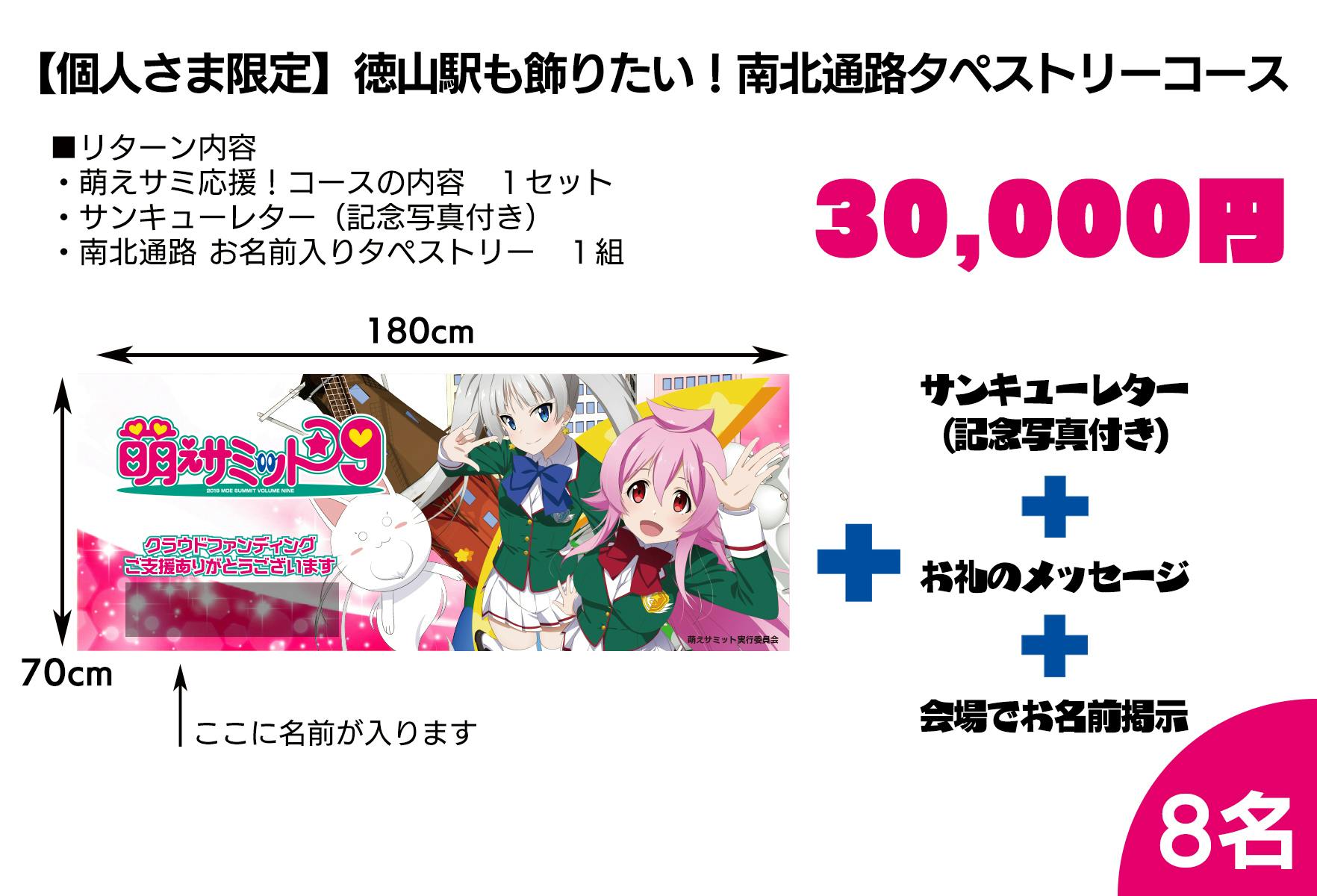 萌えサミットのイベント拠点の一角&電車・新幹線組の玄関口となる徳山駅の南北通路に、お名前入りの横長タペストリー(横180cm×縦70cm)を掲示するコースでつ。