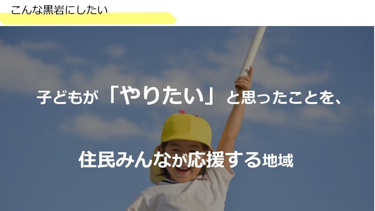 私が考える理想の黒岩像は「こどもが『やりたい』と思ったことを住民みんなが応援する地域」です。