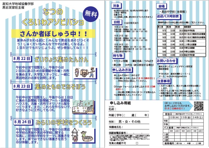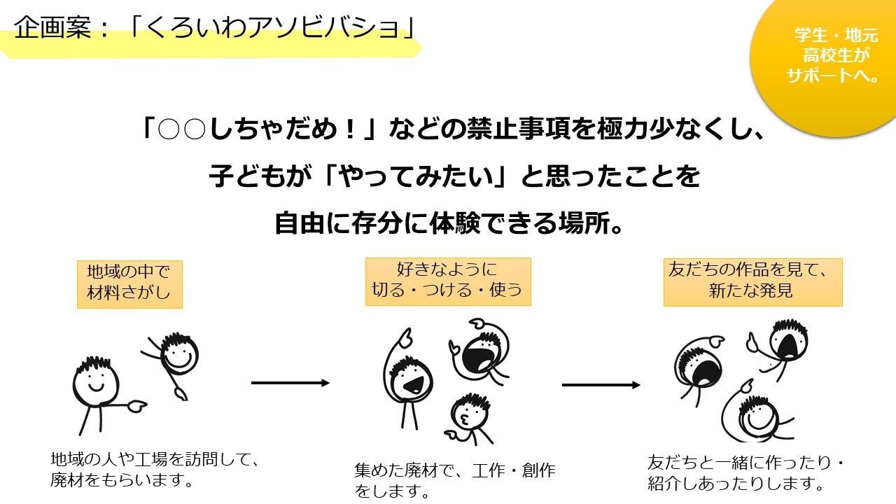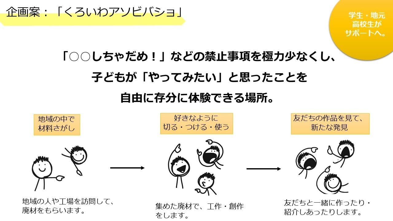 そしてこの夏、私たちは、実習地でもある黒岩地区で「くろいわアソビバショ」を開催したいと考えています。プロジェクトの概要は以下の通りです。