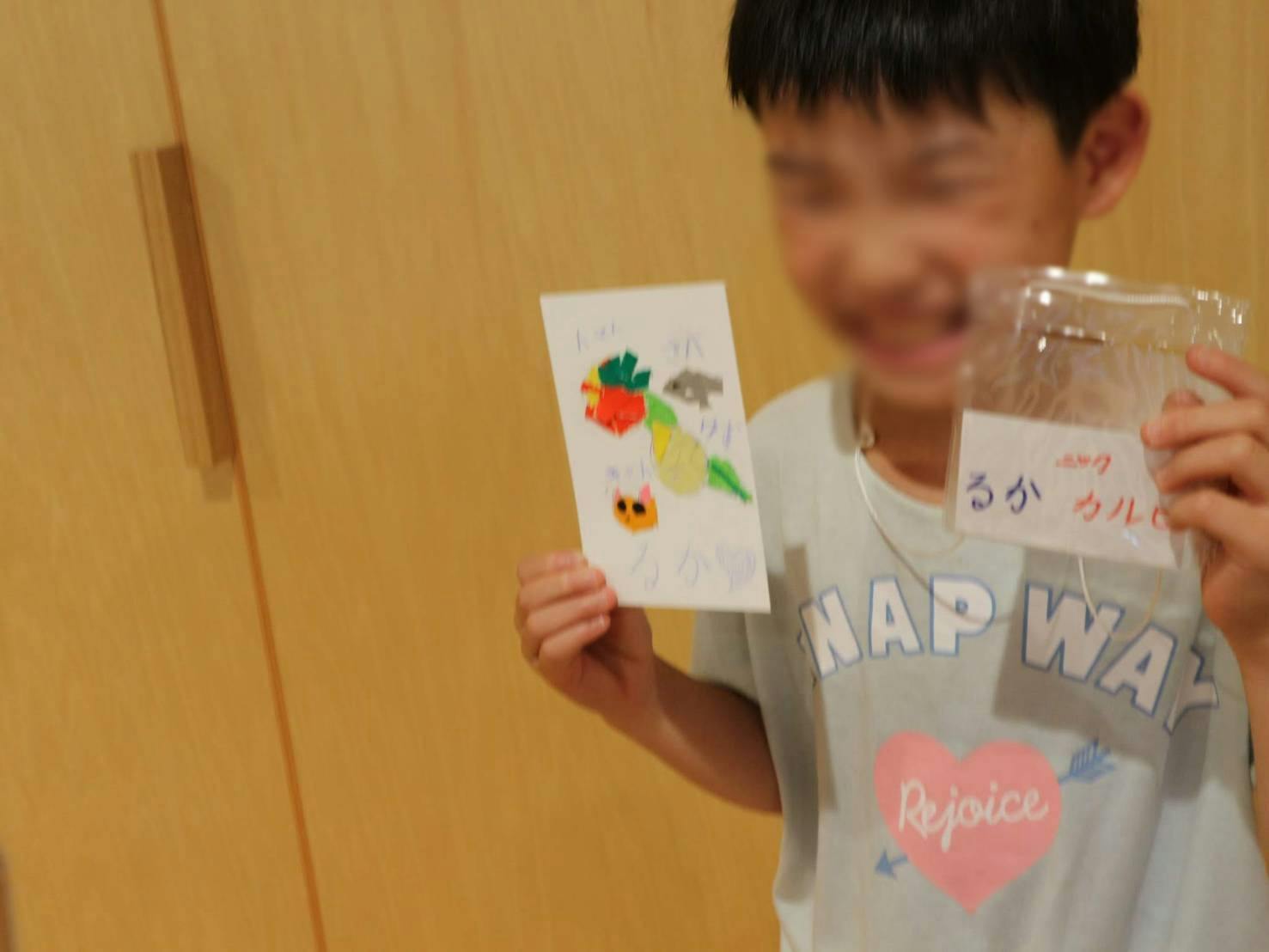 作ったのは、ちぎり絵はがきと、プラバンストラップ。