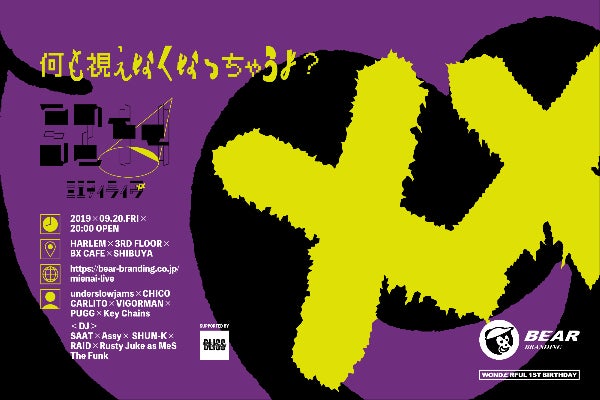 ミエナイライヴは、2019 年8 ⽉16 ⽇(⾦)に、ベアが1 才の誕⽣⽇を迎えるにあたり、スローガンである、「BE MORE UNIQUE」をテーマに、「⾃分らしさ」を喚起させることを⽬的とした何も視えない?ライヴイベント。どうなるかは全て参加者次第という、ユニークな参加型創作イベントです。