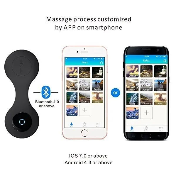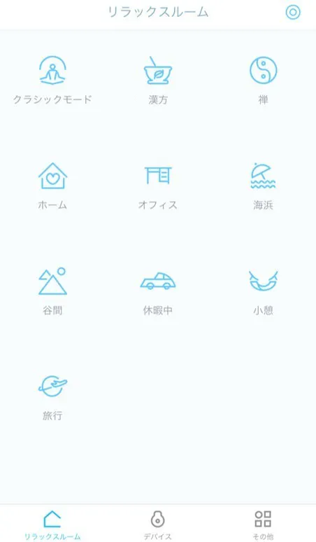 「漢方」、「禅」、「ホーム」、「オフィス」、「海浜」、「谷間」、「休暇中」、「小憩」、「旅行」などシチュエーションに応じて振動のパターンが変わる多種多様なリラックスルームをアプリに搭載しております。場所によってモードを切り替えが簡単にできます。読書や家事をしながら、音楽を聴く、運転、スポーツ、出張先や旅行先、さらに、通勤などの移動中でも使用可能です。