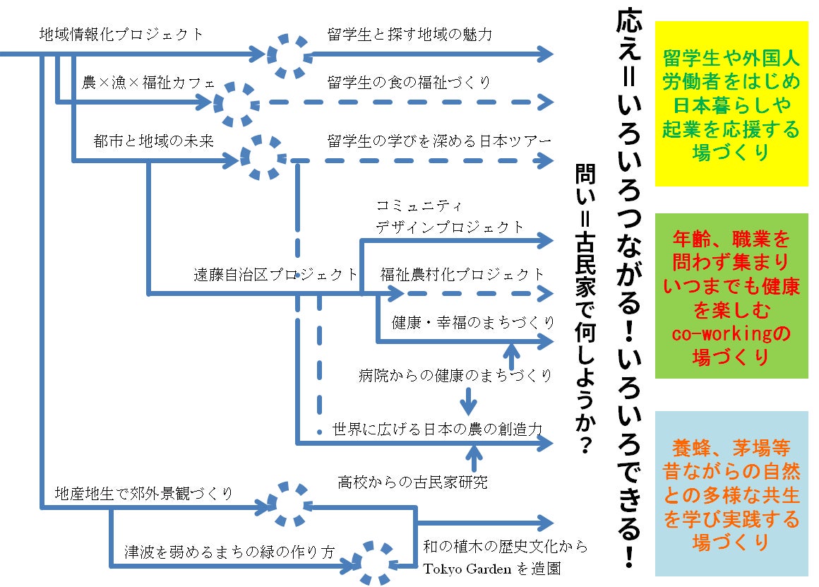 4 「こんなの商売になるのかえ?」と思われるような山野の産物を使った商品・サービス開発や、今は消えてしまった歴史の街道を掘り起こした人とものの道再建に向けて、地元の農家さん、日本大学をはじめ色々な研究室・学生さん、病院の先生方、街道沿いでまちづくりに関わる住民の方々、各方面の専門家の方々、市役所と一緒に、古民家を題材に建築、造園の実際の施工や修繕をしたり、農林作業したり、飲み食いして、交流を楽しむ