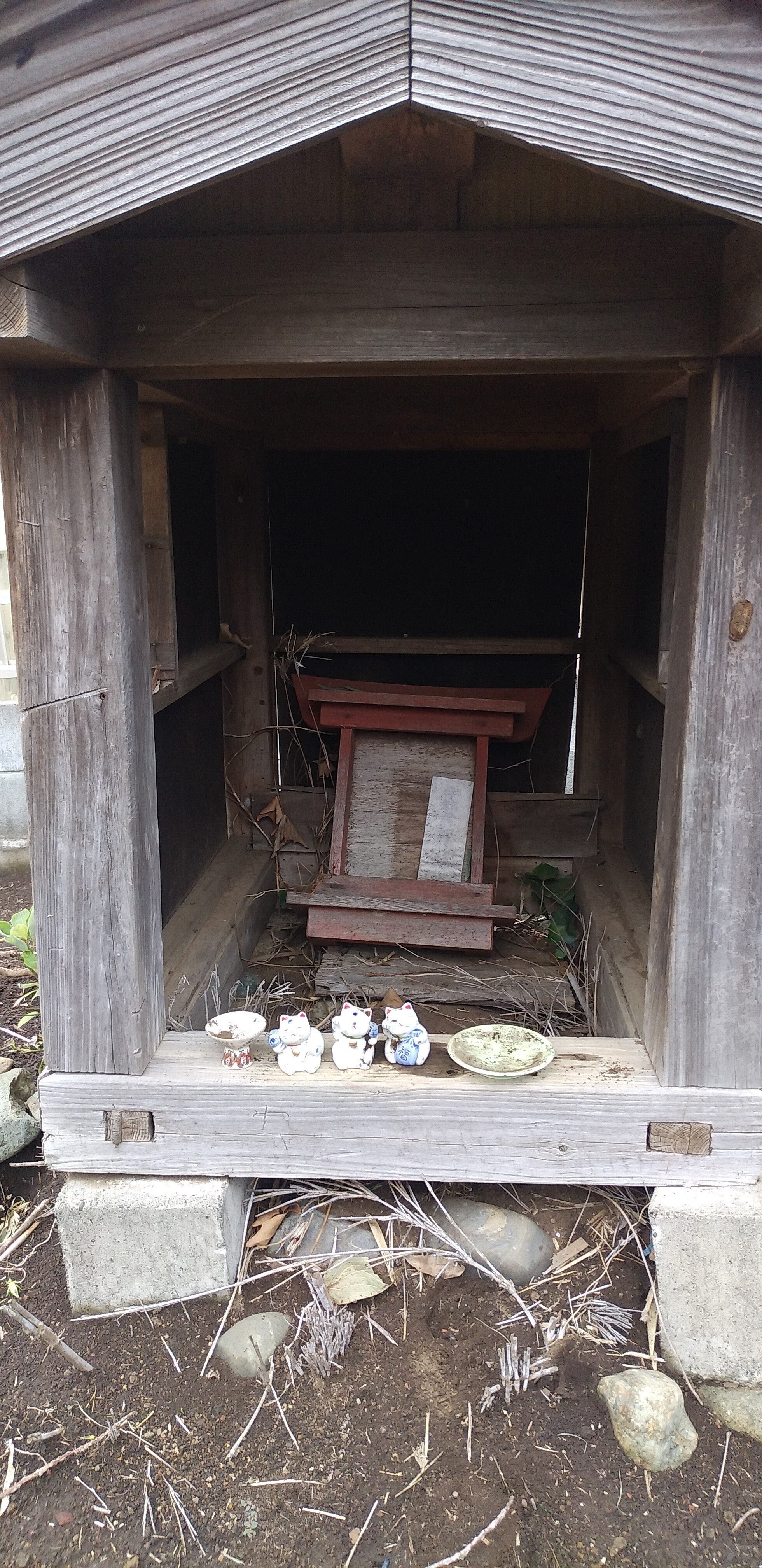 氏神様の宇都母知神社の御札がまつられてましたが、神棚は壊れて土まみれになり、御札の文字は薄れて土をかぶり、お神酒やお米をささげる杯は土に埋もれてました。また、七福猫も土に埋もれてるだけでなく、三体が消えてました。写真には三体しか映ってませんが、もう一体土の中から見つかりました。
