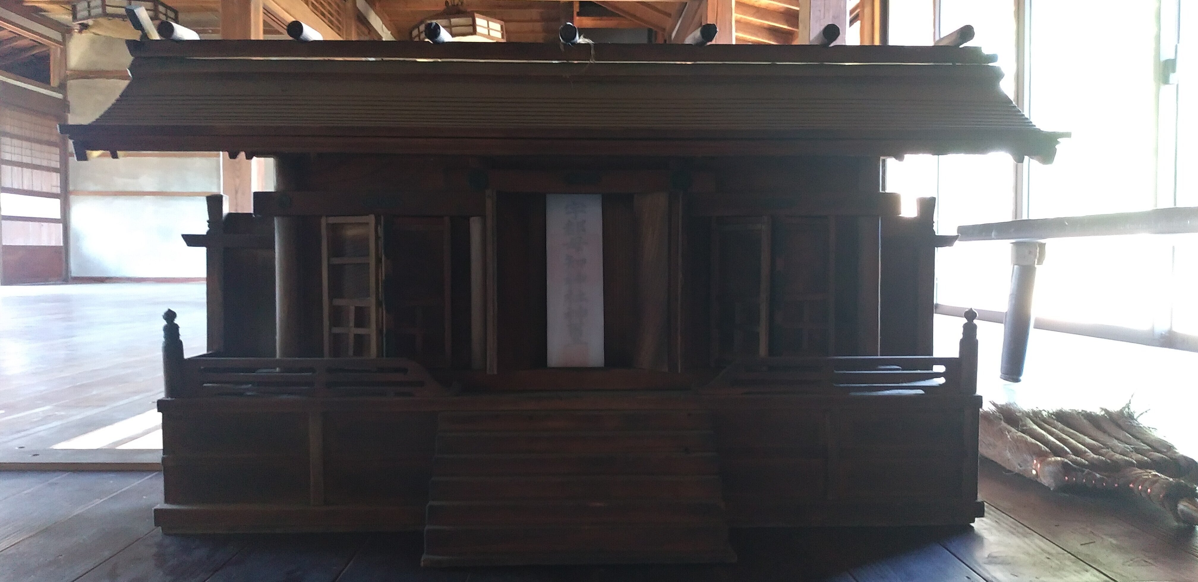 この神棚も、古民家の天井裏に残されていたものです。昔は、座敷の上に祀ってあったそうです。この神棚にも、氏神様の宇都母知神社の御札がおかれてました。天井裏からおろしてきて、ほこりをはたいて、きれいにしました。いくつかの部材が欠損していたり、扉が開かないなどの不具合もあるので、雑巾でふくと余計壊れるのではと危惧してます。この神棚も直したいと思っています。