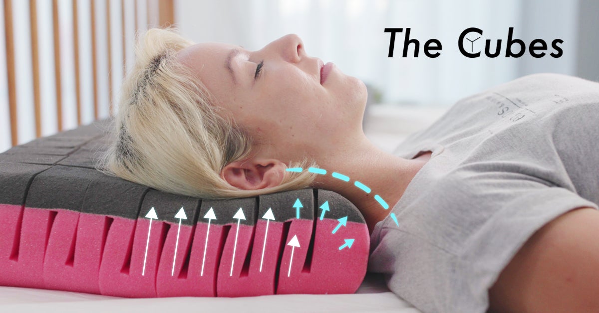 キューブひとつひとつが頭の形に沿って重さを支えることで、どのような寝姿勢でも頭しっかりと包み込み、体に負担のかからないよう設計されています。