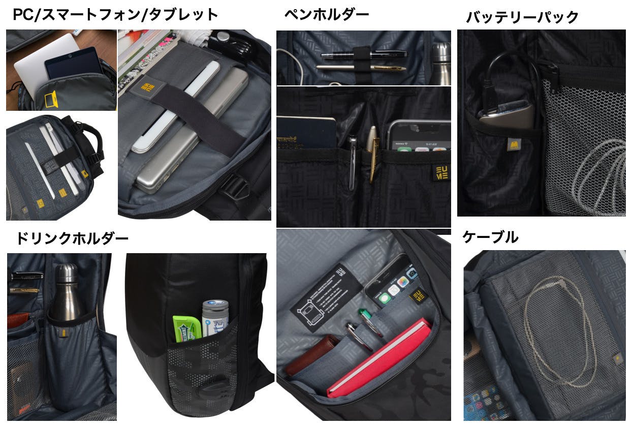 EUMEはすべてのシリーズにおいてPC、スマートフォン、タブレットだけではなく、ペンホルダーやバッテリーパックやケーブル、お財布、ドリンクホルダーなど各用品形状に合わせたポケットを搭載したマルチポケット搭載のバックパックです。