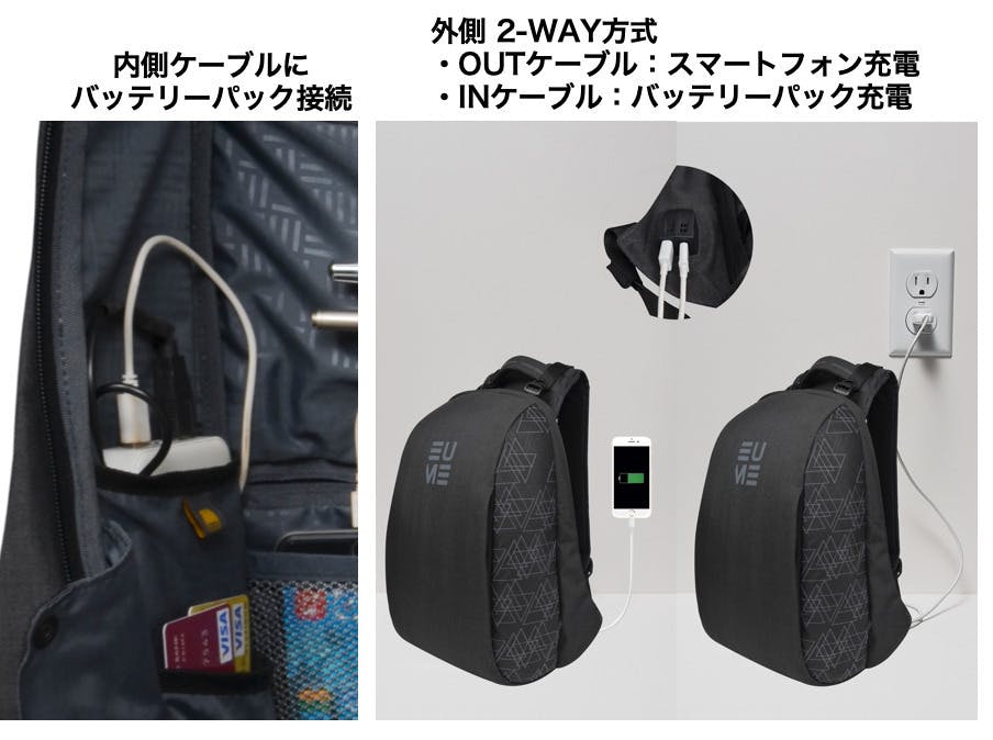 また、すべてモデルにおいてポケット内部にバッテリーパックを取り付けることで、取り出すことなくバッテリーパックの充電&バックから直接スマートフォンなどの充電も可能。