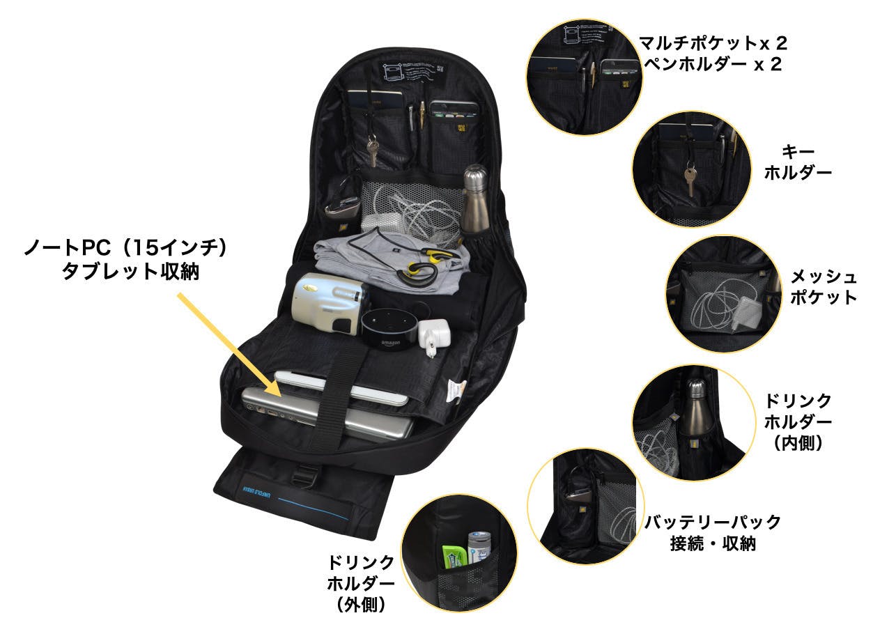各ポケットが必要性に応じて手に取りやすい位置に配置。散らばりやすい小物を整理しやすくすることで、清潔さや紛失防止なども出来る「使いやすさに徹底的にこだわったバッグパック」です。