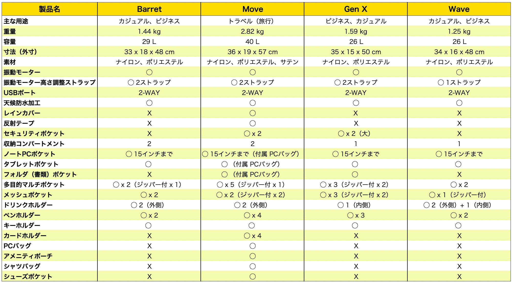 ・Travel MOVE: 外側ストラップの色が黄色からブラックに変更、レインカバーがネイビーからブラックに変更