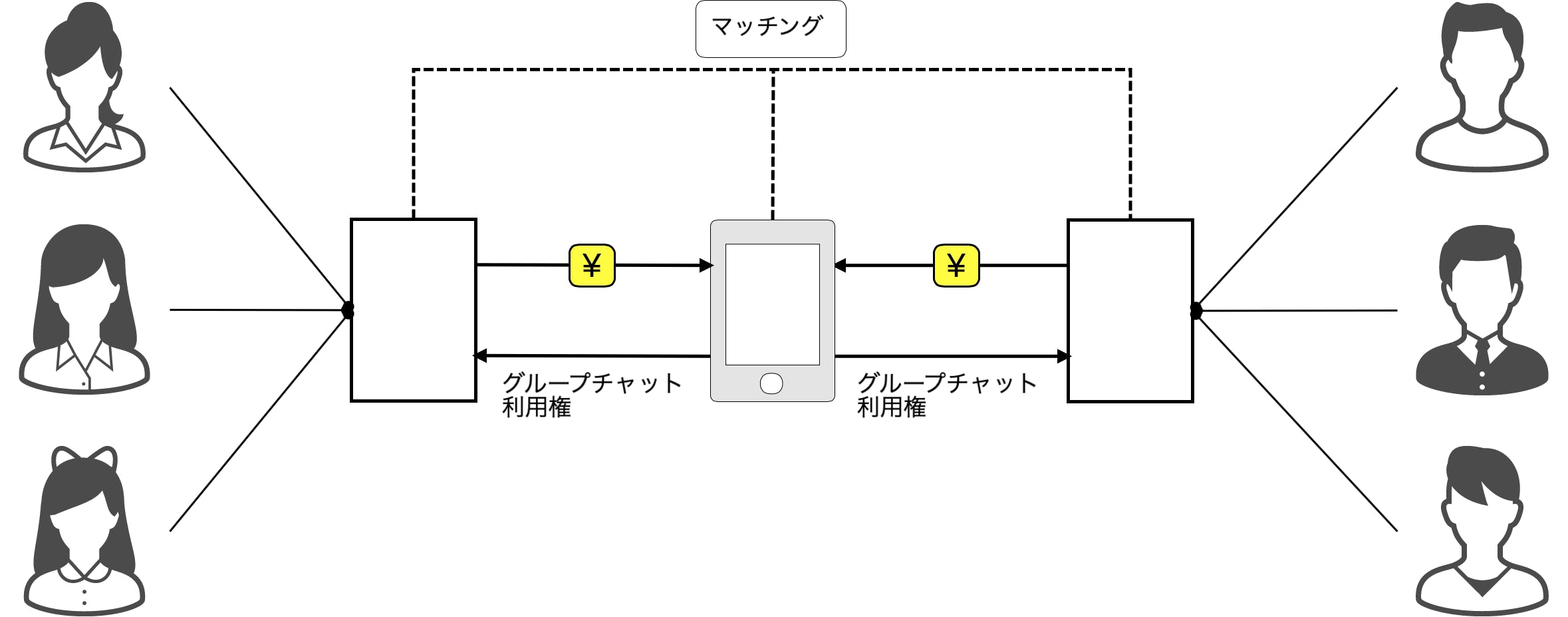 当サービスは従来のマッチングアプリにはない、複数ユーザー間のマッチングをサポートいたします。