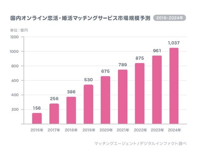 また、19年1月に発表されたオンライン恋活・婚活マッチングサービスの市場規模予測では、