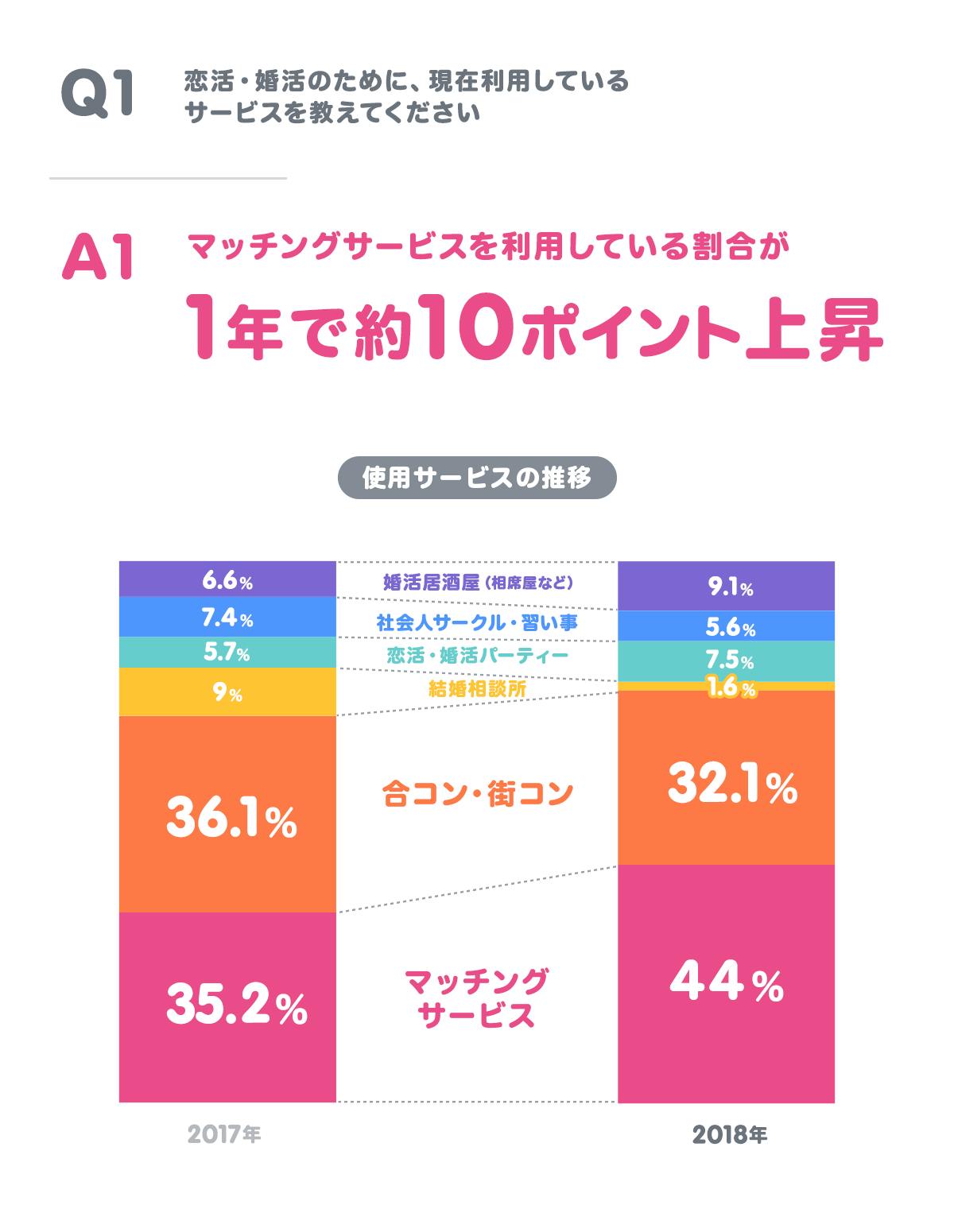 株式会社サイバーエージェント(本社:東京都渋谷区、代表取締役社長:藤田晋、東証一部上場:証券コード4751)の連結子会社でマッチングサービス「タップル誕生」を運営する株式会社マッチングエージェント(本社:東京都渋谷区、代表取締役社長:合田武広)が2018年12月に発表したマッチングアプリの利用に関する意識調査では、オンラインでの恋活・婚活マッチングサービスを利用する割合が増加し、他のサービスよりも利用割合が高いという結果になりました。