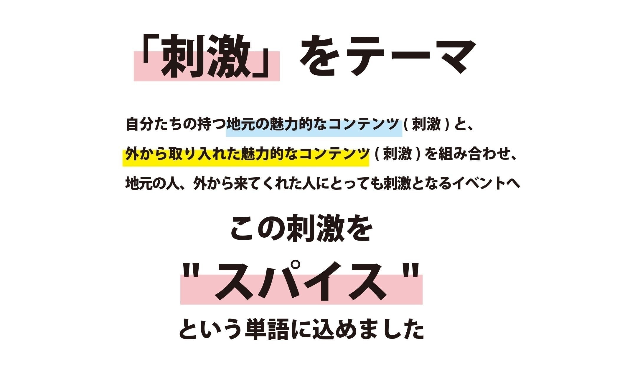 自分たちの持つ地元の魅力的なコンテンツ(刺激)と、外から取り入れた魅力的なコンテンツ(刺激)を組み合わせ、内外の人にとって刺激となるイベントへ。