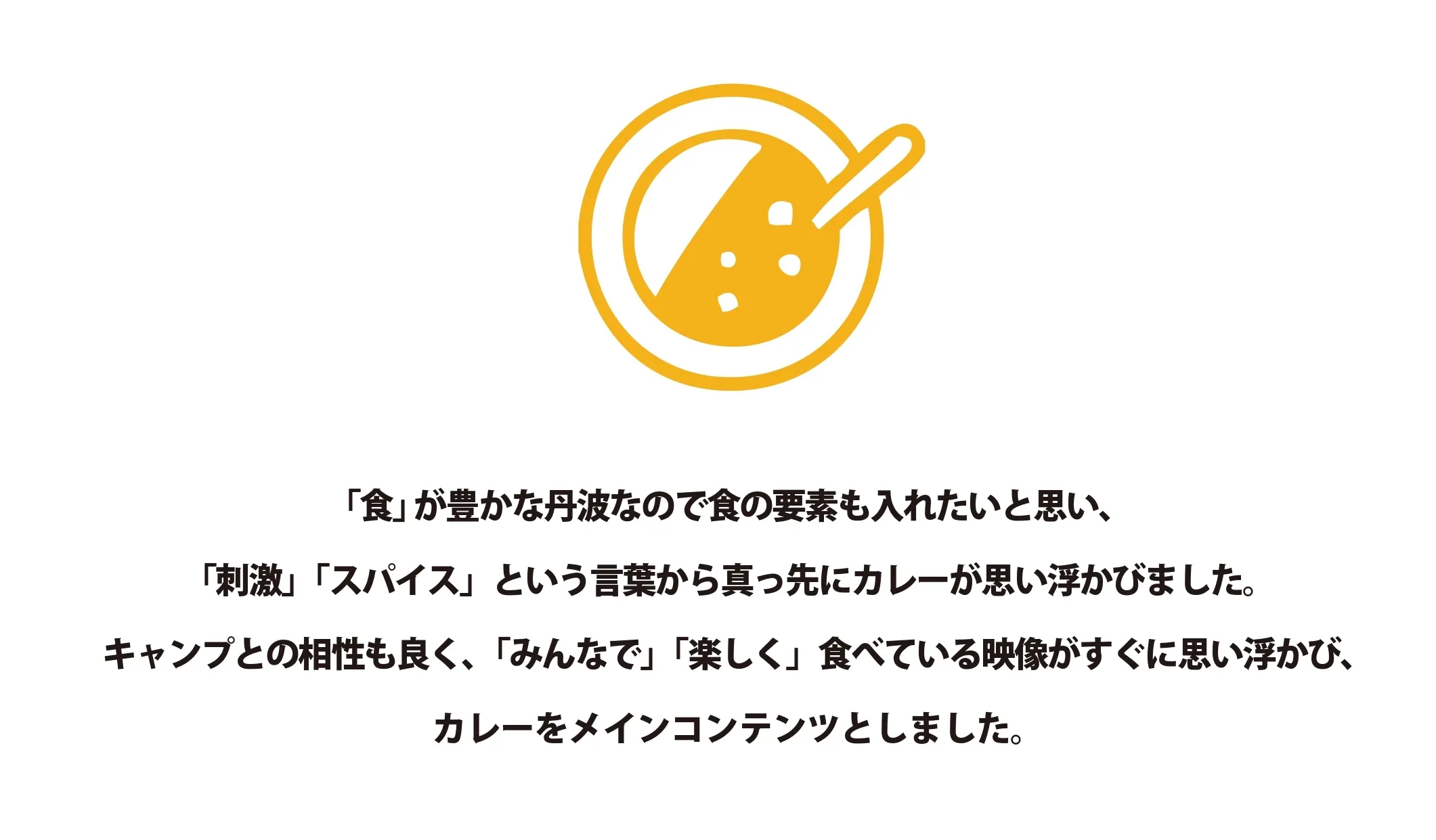 キャンプとの相性も良く「みんなで」「楽しく」食べている映像がすぐに思い浮かびカレーをメインコンテンツとしました。