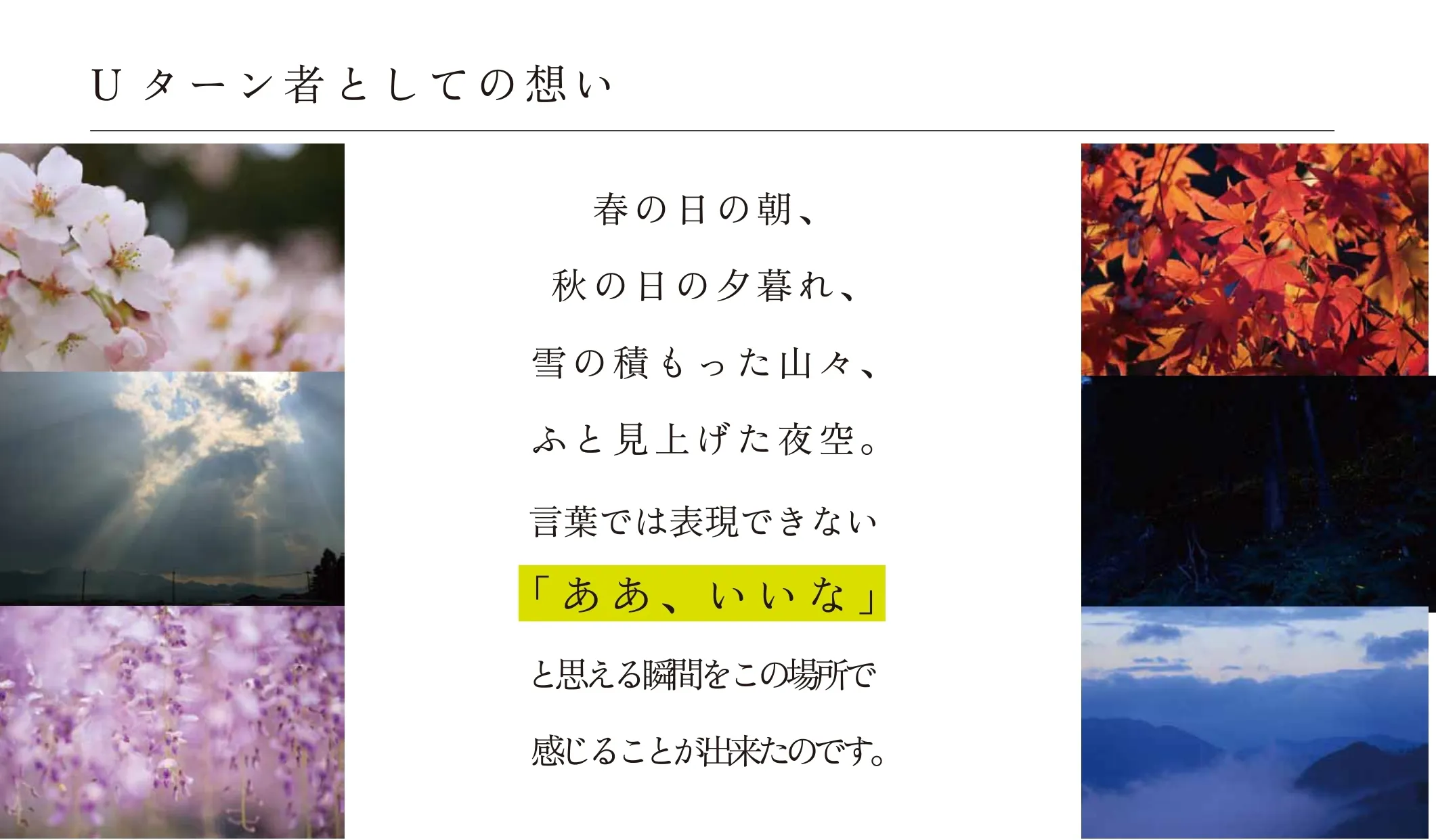 「外からの目(都会に出た経験、丹波に越してきた移住者たちとの関わり)」で自分たちの環境の豊かさに気付くことができました。