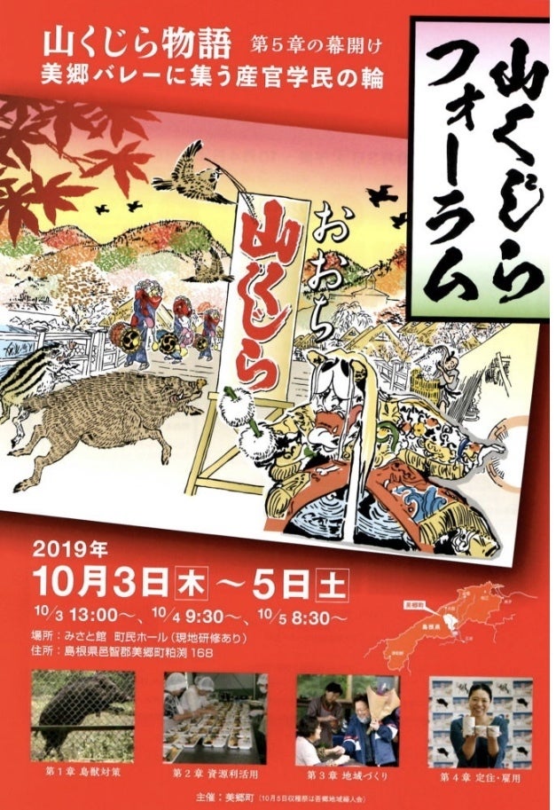 島根県 美郷町では、10月3、4、5日で『山くじらフォーラム』を開催中です。イノシシやシカとどう向き合い、対策を進めるか興味を持っている方々が全国からこの山奥に数百人が結集しています。美郷町では、この土地が獣害対策の叡智が集う場にしたい、という想いから獣害対策型のシリコンバレー、『みさとバレー』構想を進めています。その一環としての山くじらフォーラム私も先程登壇させていただき、山くじらの取組みをお話させていただきました。エントンスでは、缶詰販売と処理場建設の地元の酒蔵の樽で募金活動も実施中!