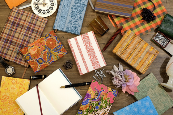 世界各国の生地や皮革を表紙に用いて、本のように中に厚紙などをしこみ、かっちりとした上製本を手作業にて仕立てていきます。