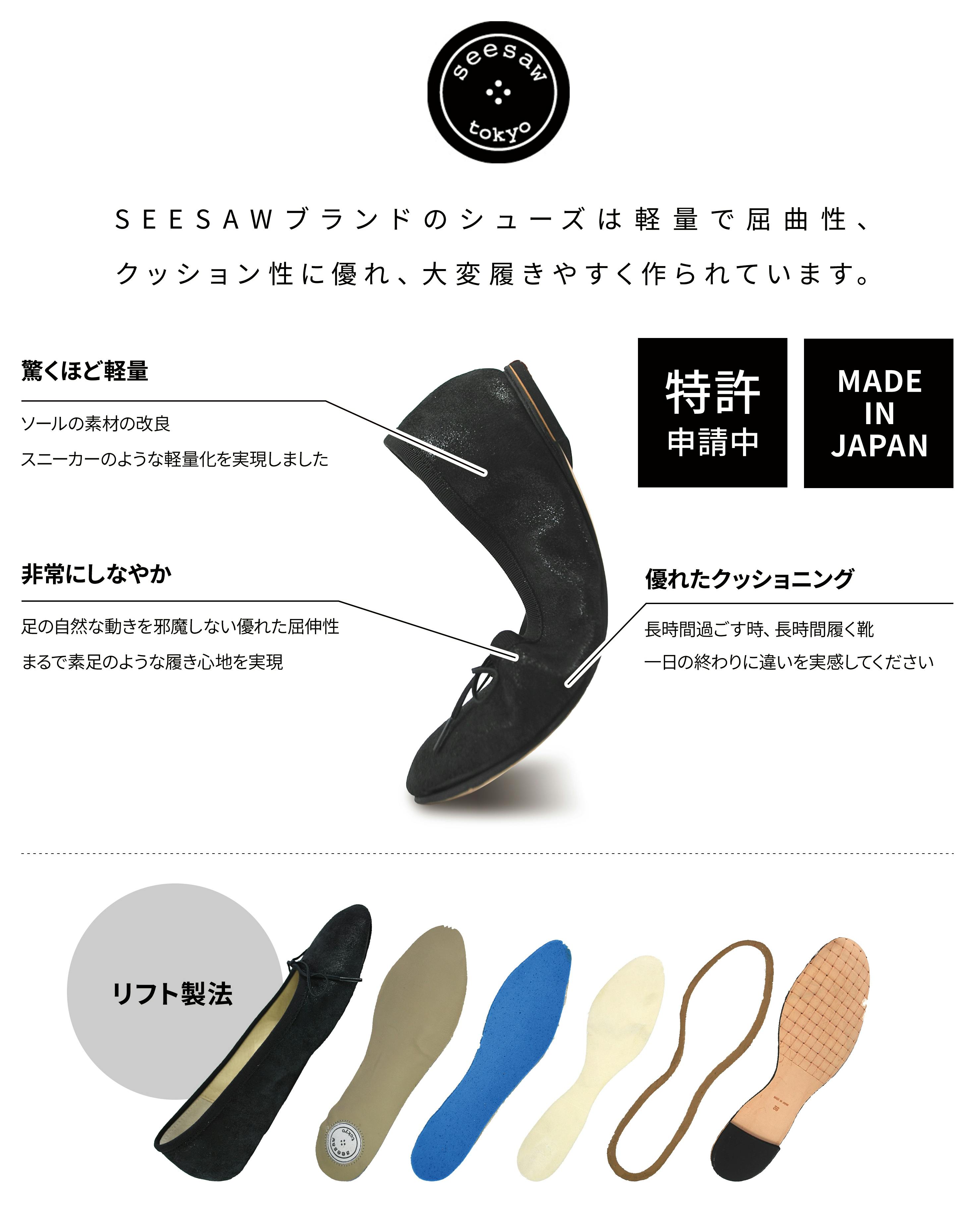 軽量でしなやかなソールのリフト製法のバレエシューズは持ち運びにも適した旅にピッタリなバレエシューズです。