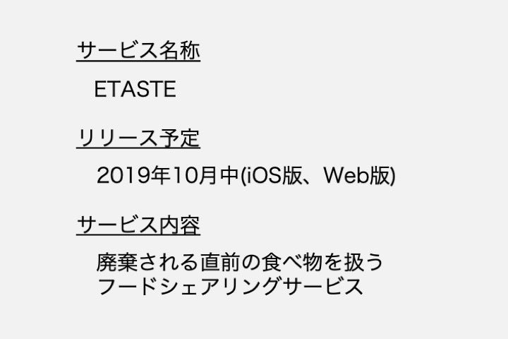 今回のプロジェクトでは、廃棄される直前の食べ物を消費者が定価よりも低い値段で購入できるフードシェアリングサービス「ETASTE」を主たる事業とした会社を立ち上げます。