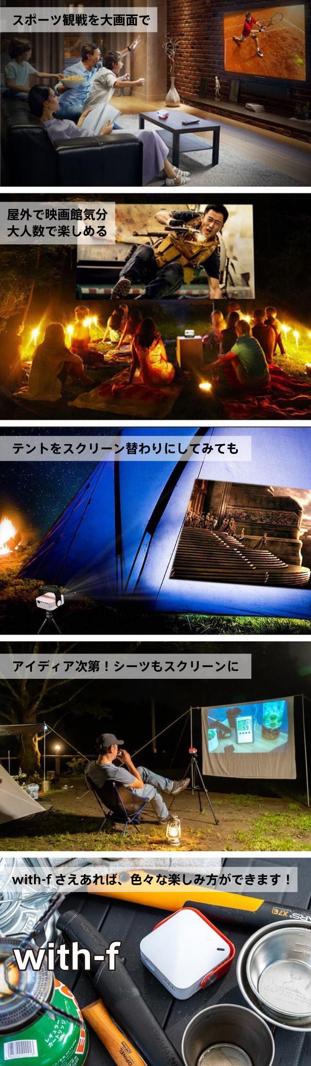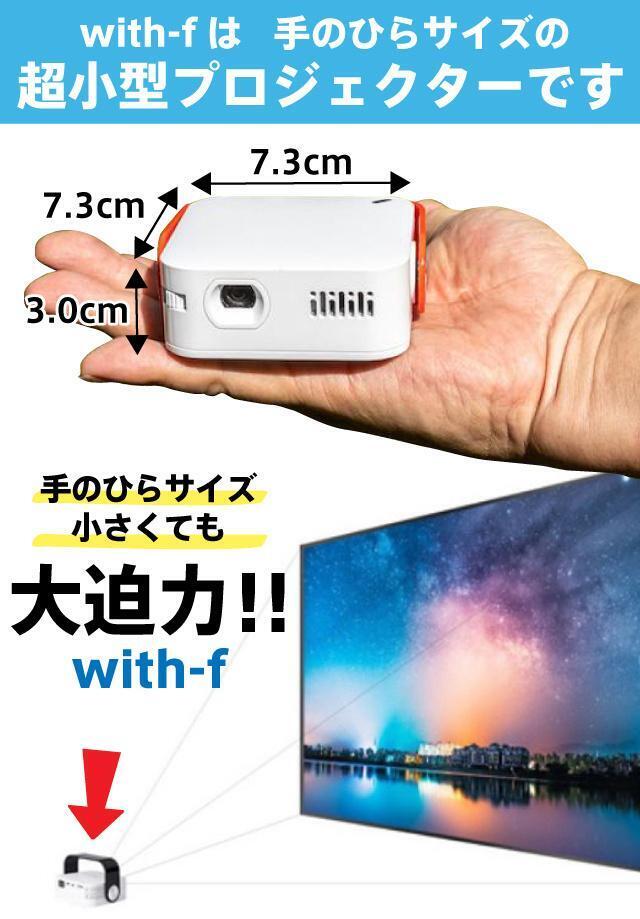 with-f(ウィズエフ)は、超小型・軽量でありながら、AndroidOS搭載、120インチ対応、Bluetooth、WiFi接続など最先端の機能を備えた次世代型プロジェクターです。