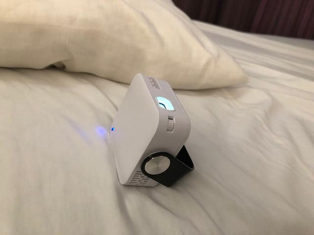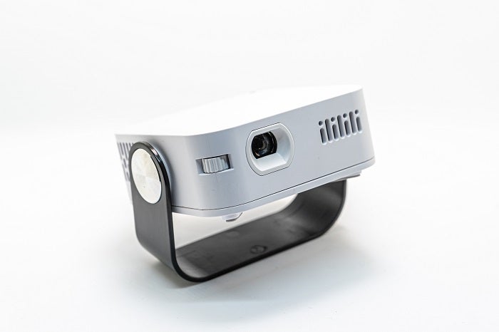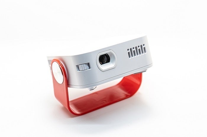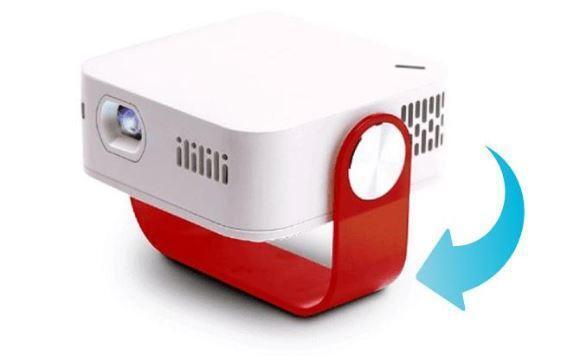 当社ではキューブ型のミニプロジェクターも取り扱っておりますが、キューブ型プロジェクターに比べて厚みがないため、ハンドバックやポケットにも入れやすく、回転型のハンドルで角度調整が可能なため、専用スタンド無しでも安定設置できます。