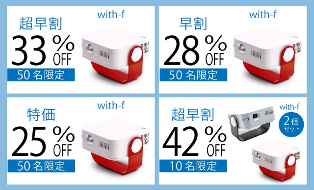 2019/11/17 08:28本日プロジェクト終了します!まだご検討中の方は年内にwith-fを手にできる最後のチャンスですので、お見逃しなく!プロジェクト終了後すぐに出荷準備を開始しますので、12月の下旬までにはご支援者様にwith-fをお届けできます。年末年始は帰省先や旅行先にwith-fを持っていっていただき、映画や動画を大画面で鑑賞したり、お子様にアニメ動画やYoutubeを見せてあげたり、ぜひご活用ください!もちろんご自宅でも大活躍すると思いますよ。天井に写して寝ながら見るのが、オススメです。正月はwith-fとのんびりお過ごしください^^ もっと見るGoods Pressに掲載されました!