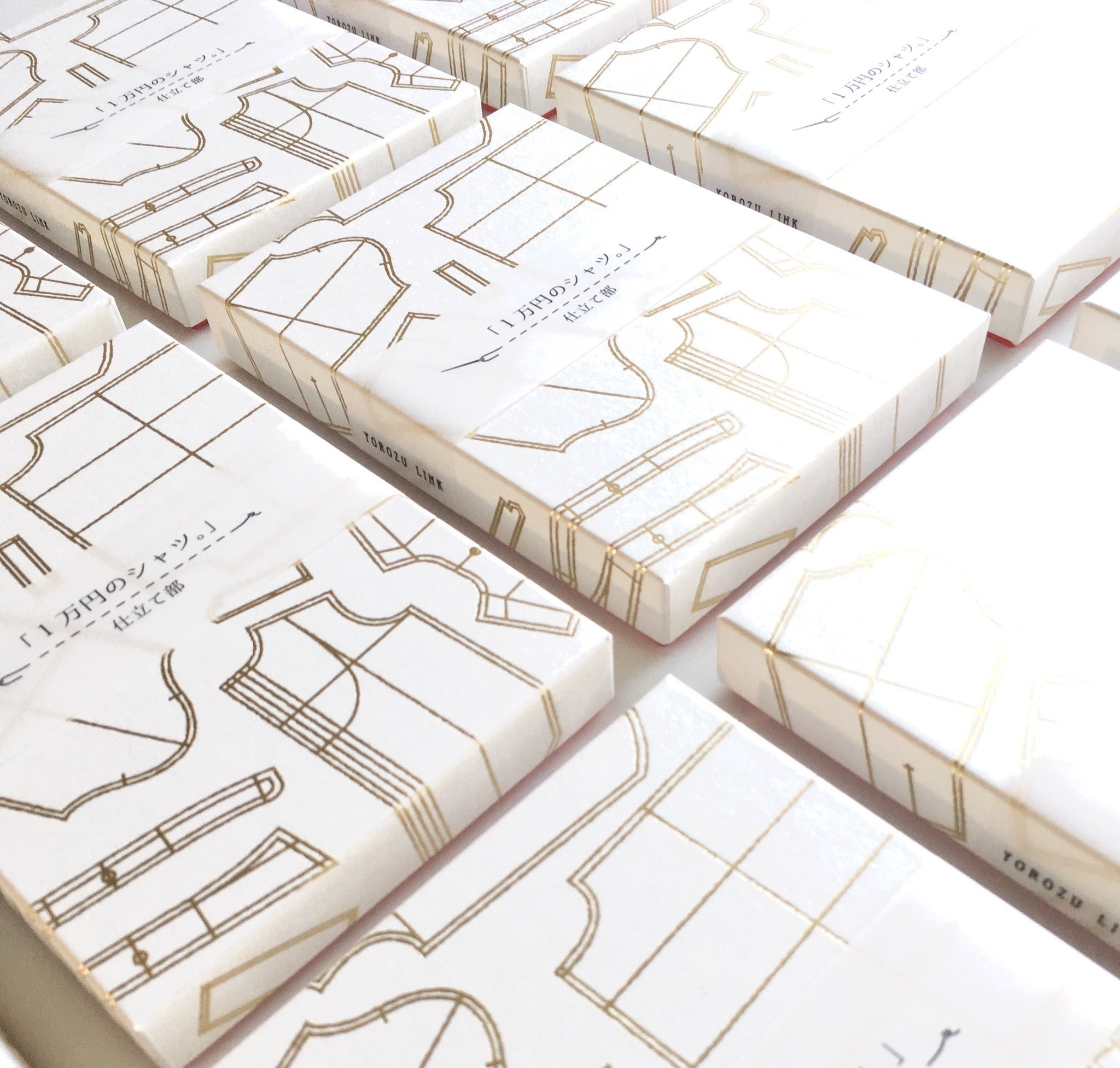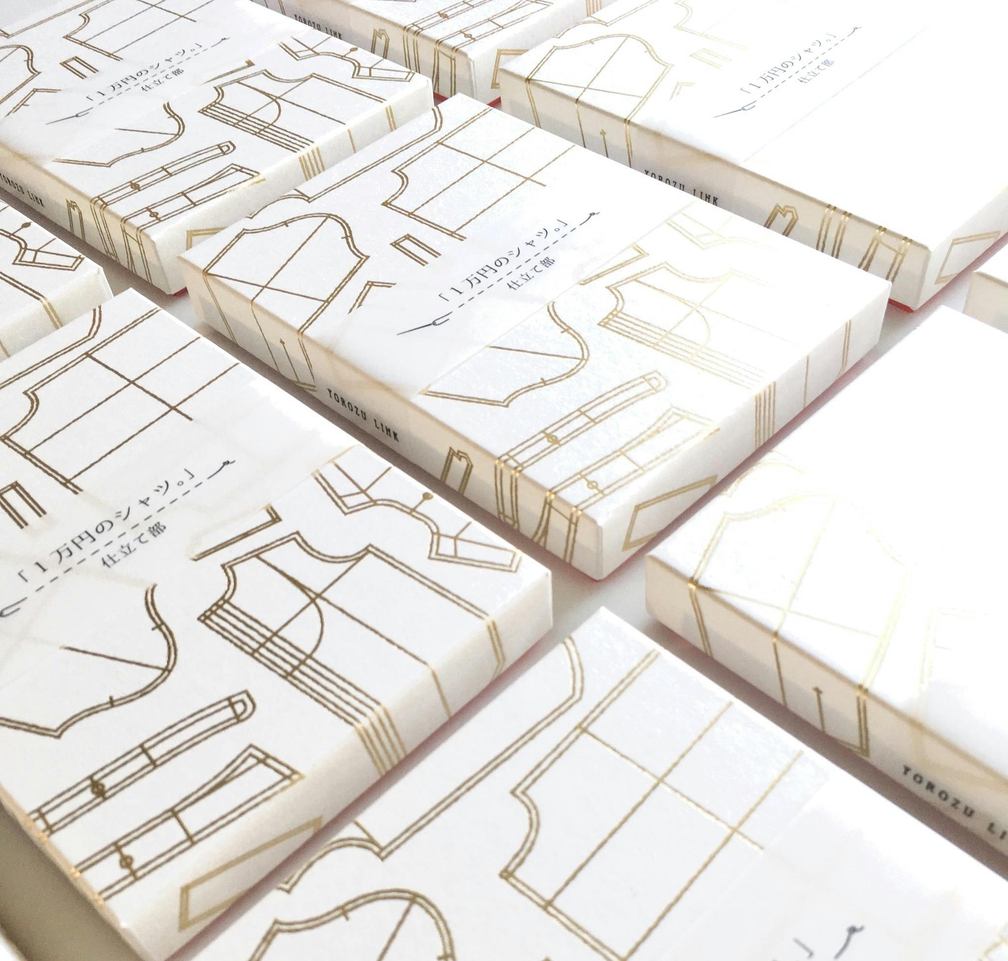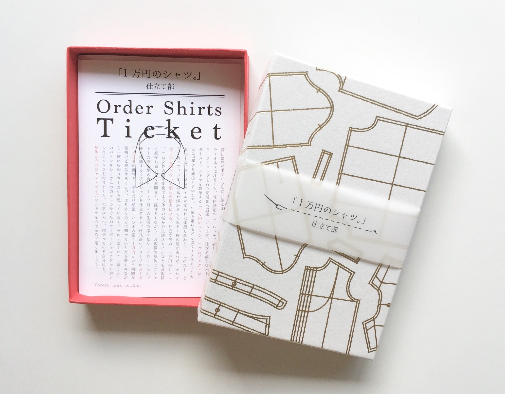 白と赤を基調にして、蓋にはゴールドの箔押しでシャツのパターン(型紙)が