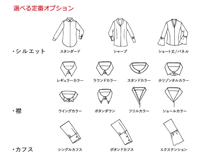 生地、スタイル、襟、カフスをお選び頂きます。