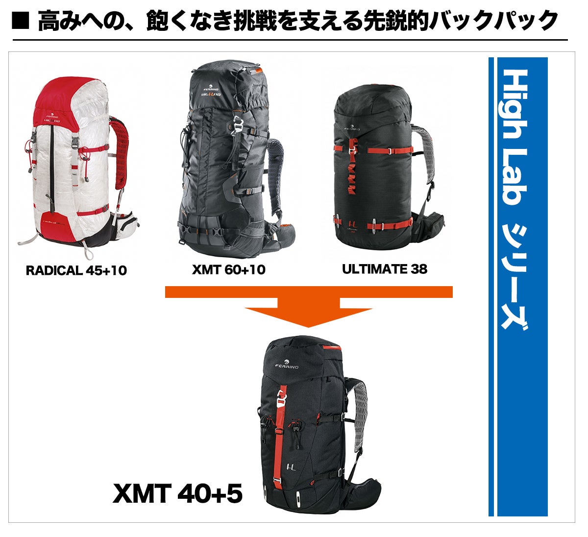 売れるかどうかではない。あなたのチャレンジに貢献できるかどうかが、High Labシリーズ開発のベースとなっています。そしてフェリーノの開発チームが、極限に挑戦する冒険家と同じように挑戦し、本当に作りたかったアルパイン・パックをついに発表しました。