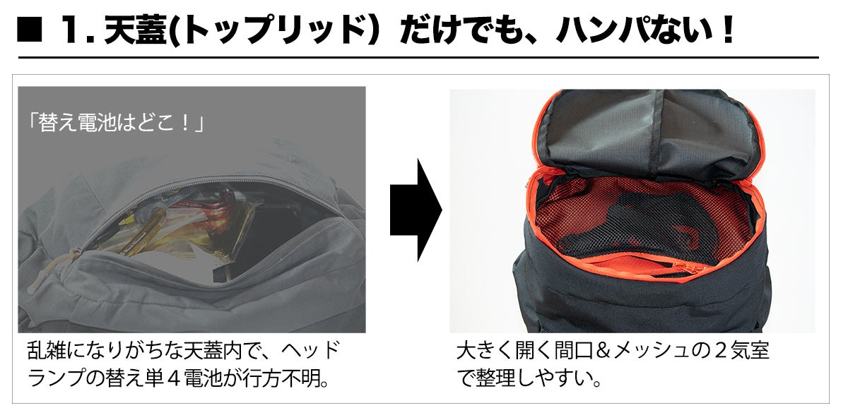 「行動食を出した拍子にスマホを一緒に落としてしまう」乱雑になると起きる不都合。2気室を使い分け、整理すれば失敗しない。