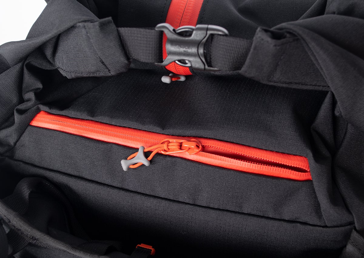 ポケットは天蓋(トップリッド)の裏側にもある。車のキー、サイフなど登山中に出し入れしないものはこちらへ。また、非常に濡れにくい部屋のため、それを考慮して有効利用したい。