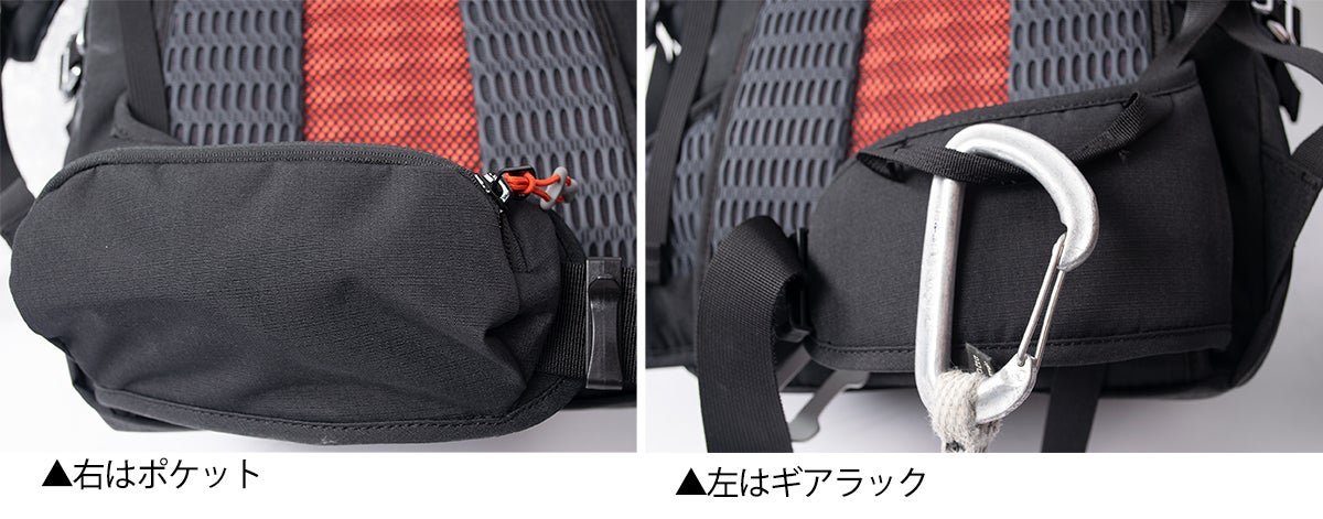 アタックザックなどの軽量ザックは生地が薄い。カラビナやクッカーの角で、背中に当たりがある。ホローバック・システムは背面にはフレーム付きのパネルが入り、ギアを背面ポケットに入れても損なうことのない背負い心地。ショルダーストラップ共に通気性を確保し、蒸れを抑え雪も付きにくい快適な特殊構造。バックポケットの利用価値を圧倒的に高めている。