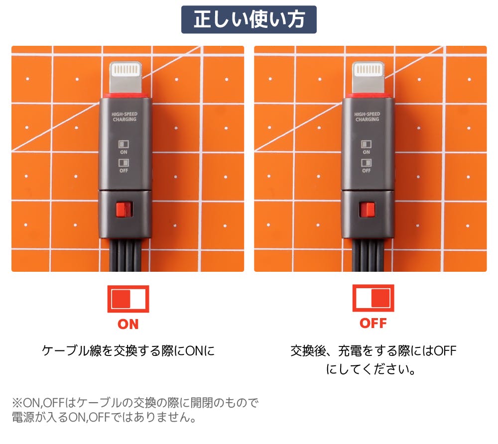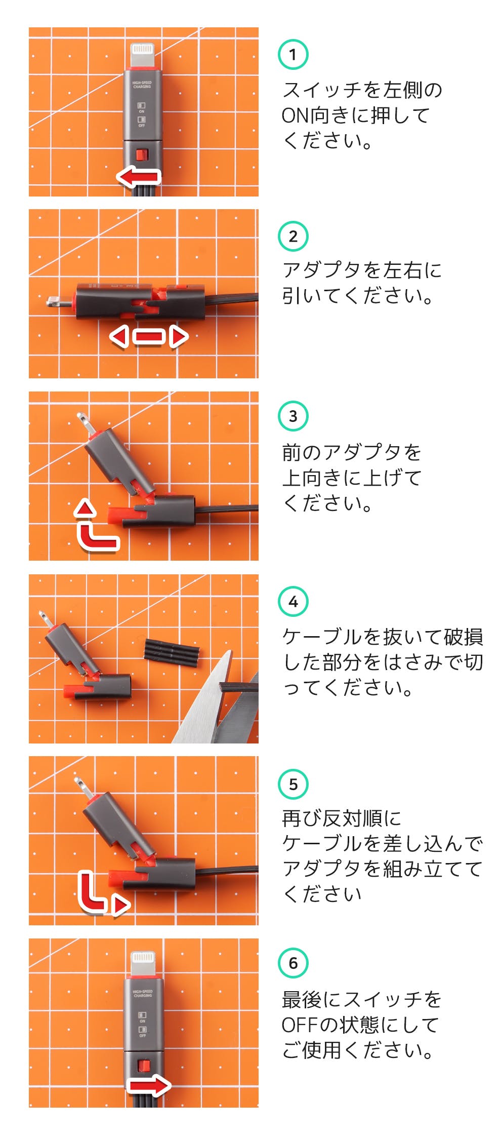 ① 機器側のアダプターとUSB側のアダプター、両端子を同時にカッティング・交換できる充電ケーブルです。