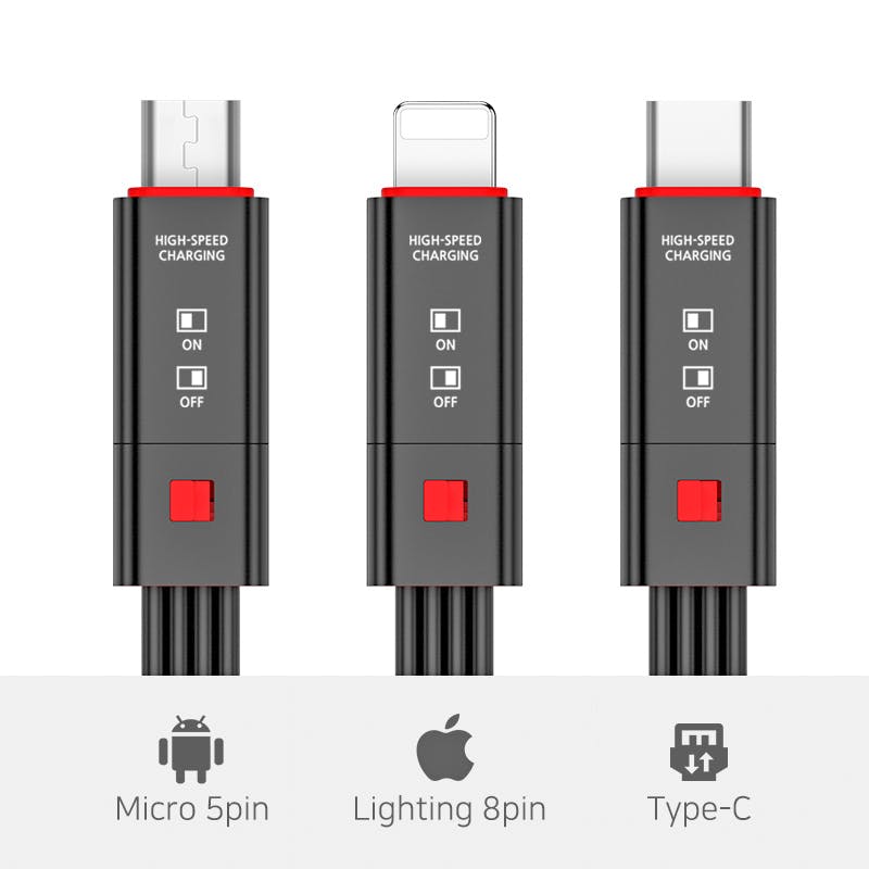 ❸ type-c・Lightning 8ピン・Micro 5ピンの対応(アダプター交換式)で、どの機器でも対応な汎用性が高い充電ケーブル(高速充電対応)