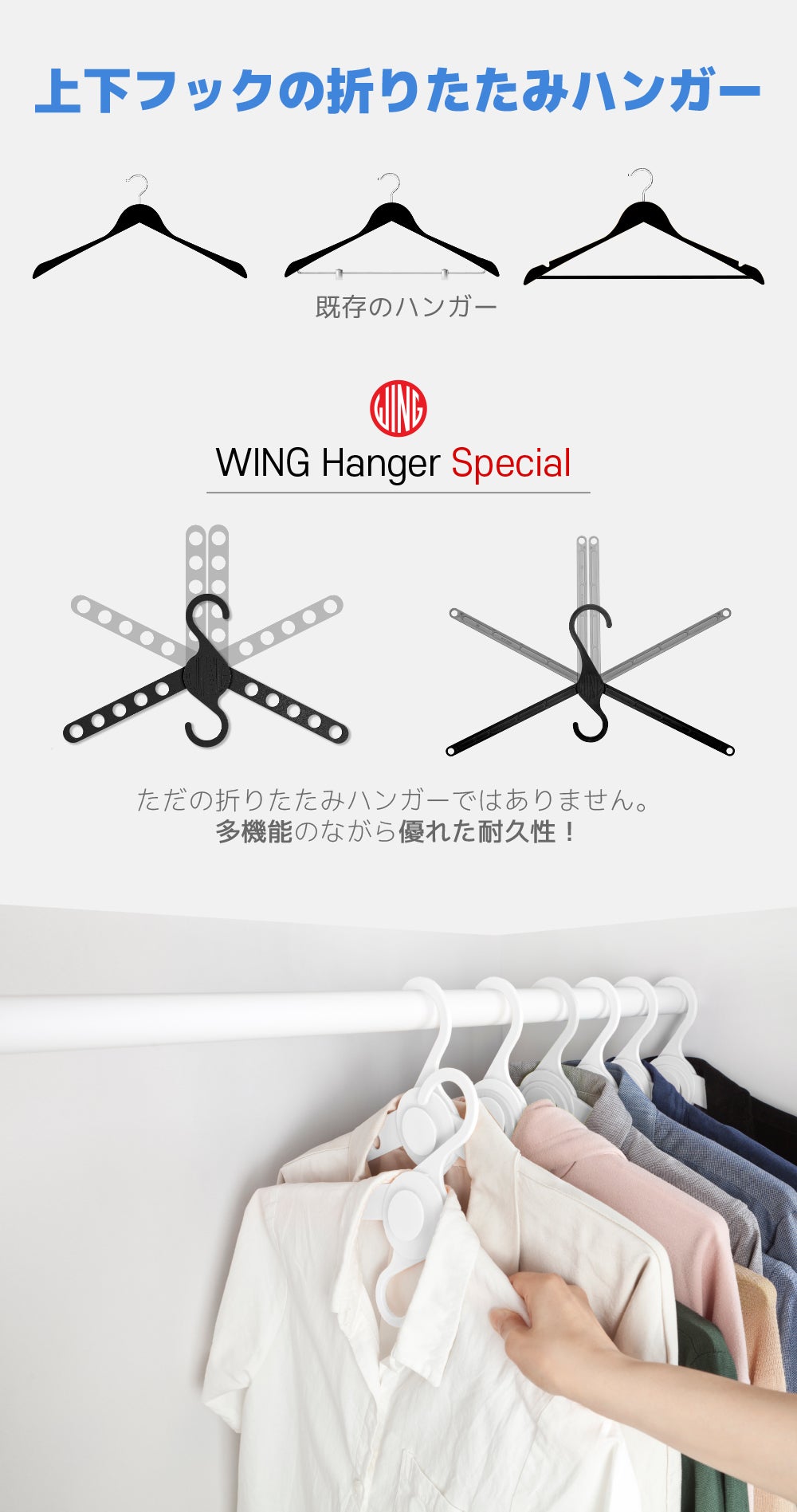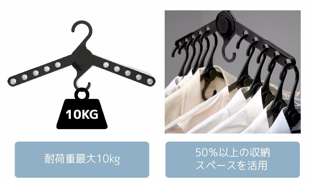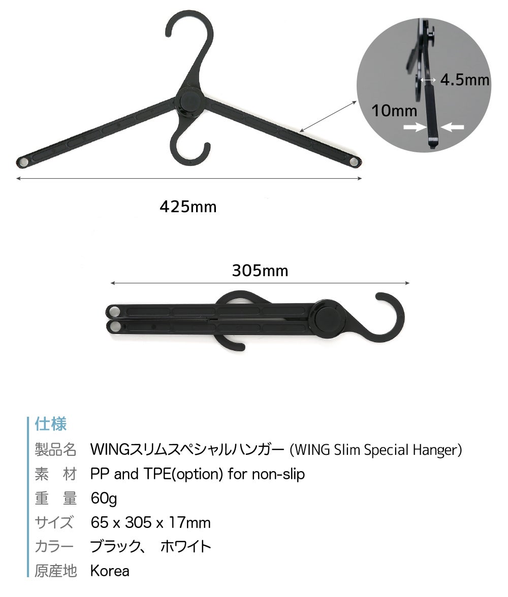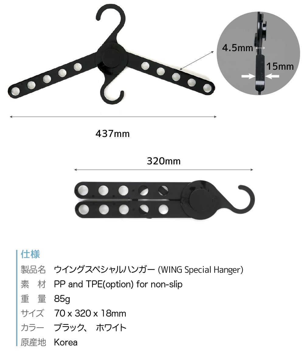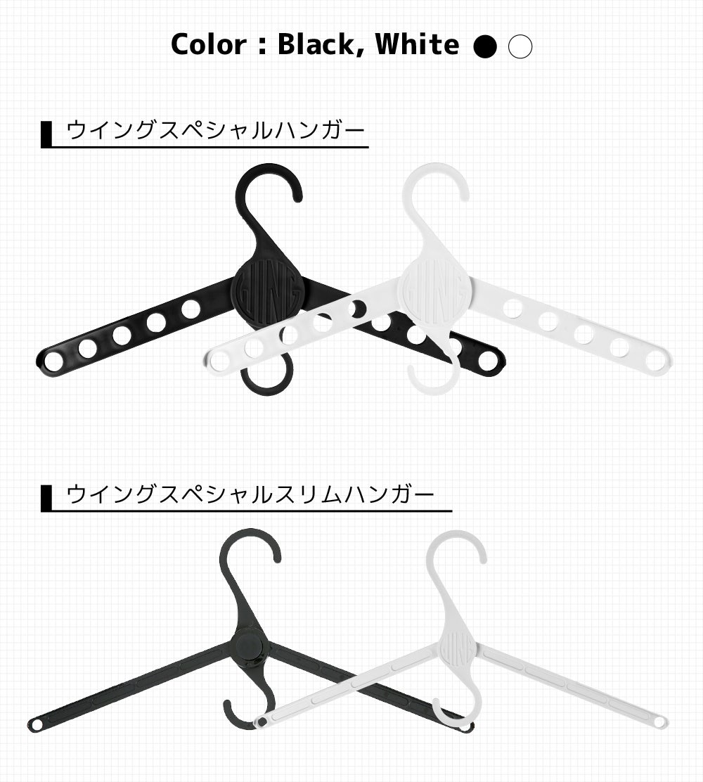 A:ウィングスペシャルハンガーはPP材質で作られており、強い耐久性を持っています。また、ウイングスリムスペシャルハンガーの場合にも、最大10kgまで描けることができます。