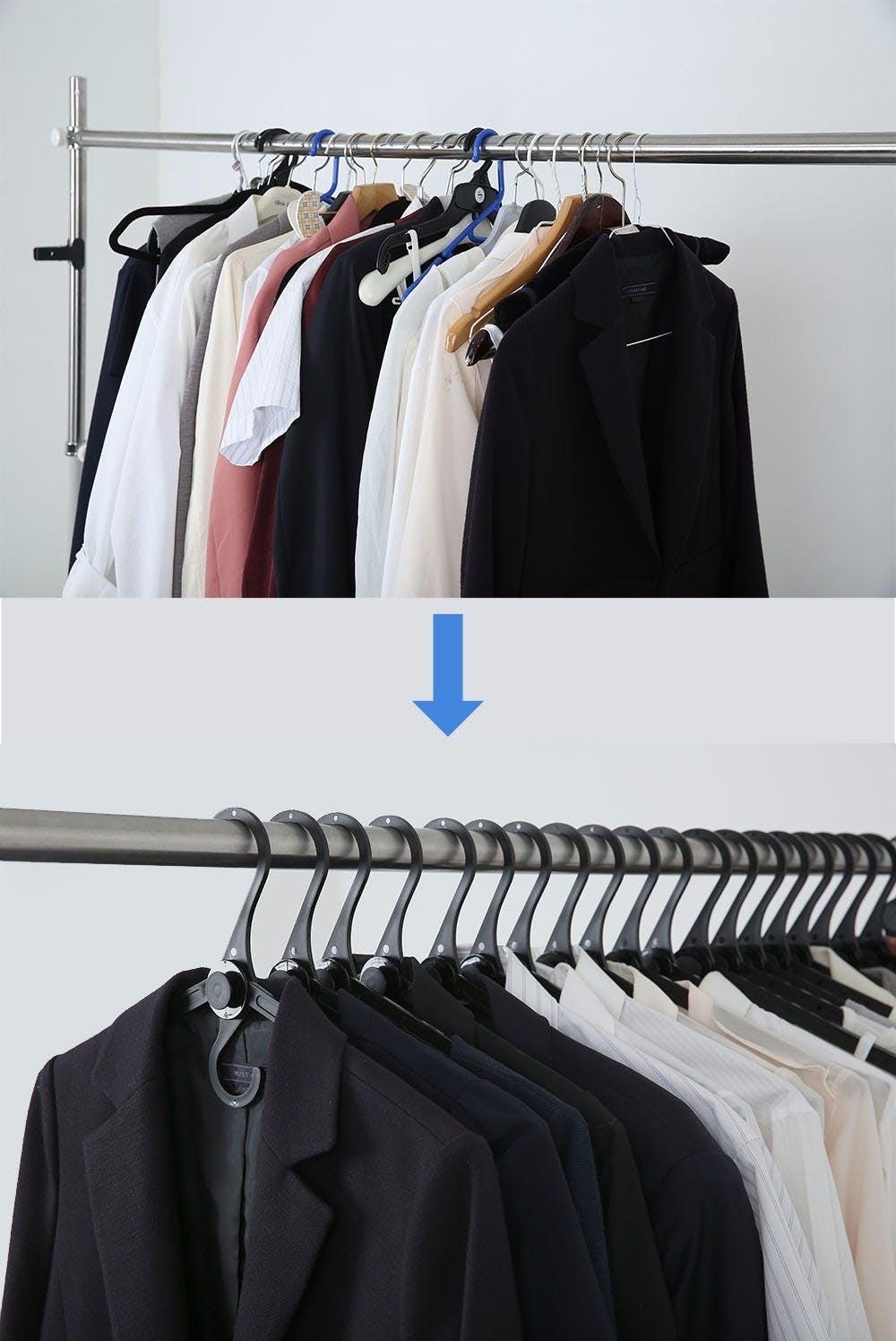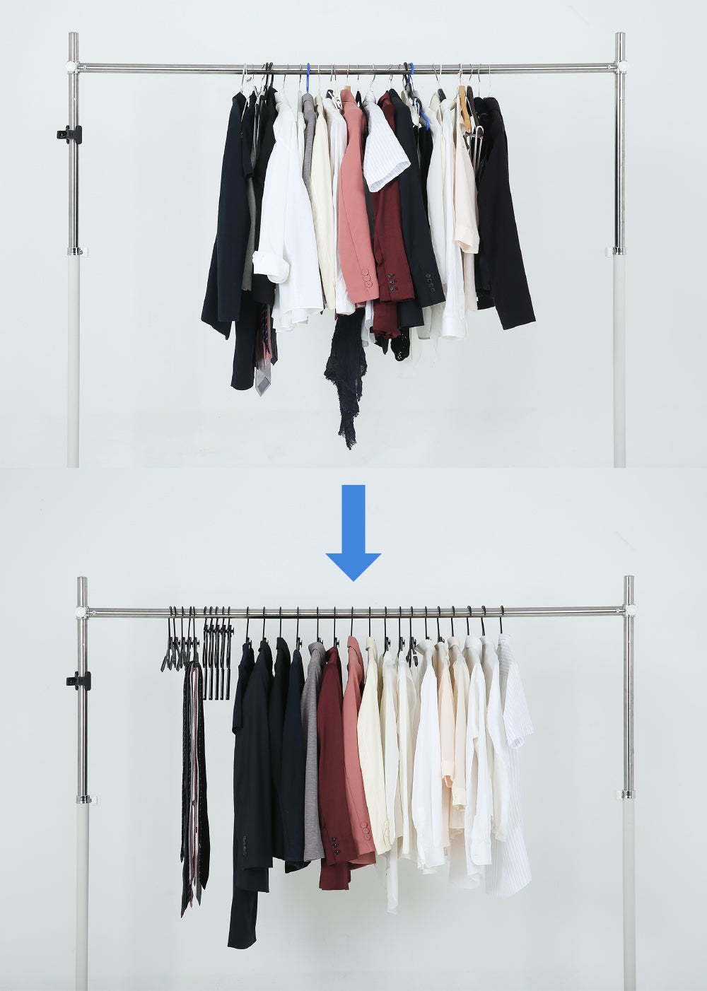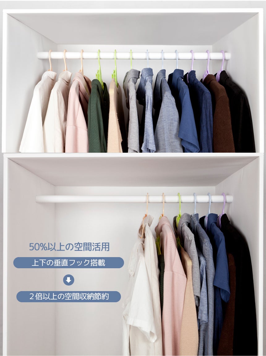ハンガーが一段でも垂直でかけられるので横幅の空間がより確保できます。