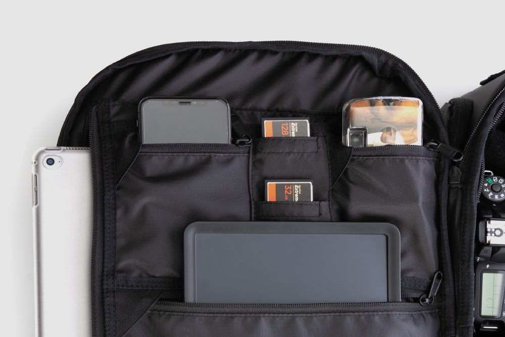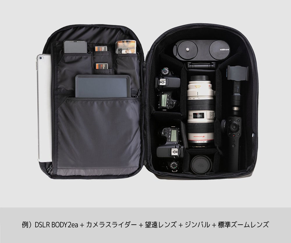 カメラボディ、ゴープロ、望遠レンズ、単焦点レンズなどの自分の撮影スタイルに合わせて自由に構成を替えて使用することができます。